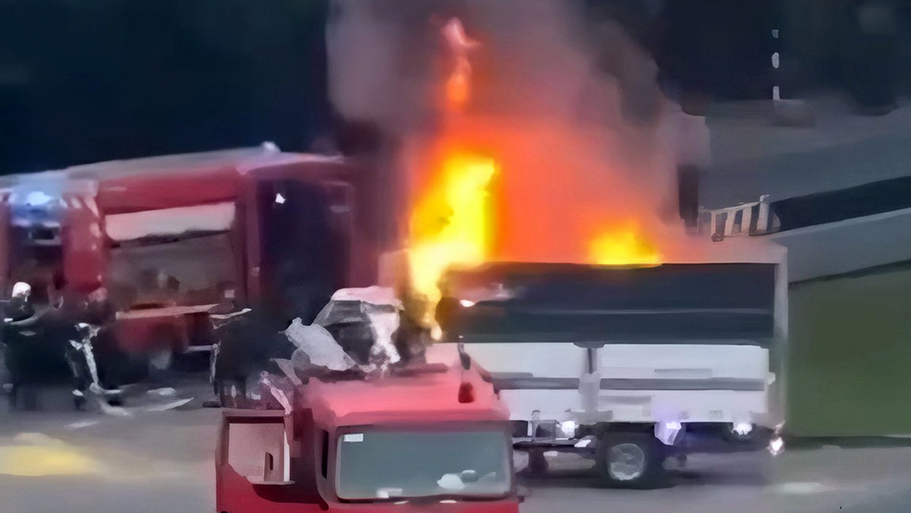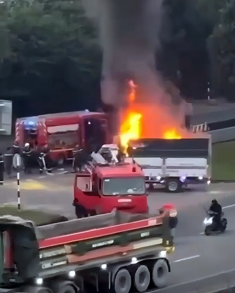 Ảnh TNGT: Đang chở hàng bất ngờ xảy ra hoả hoạn, tài xế xe tải chở thẳng đám cháy đến Đội Cảnh sát Phòng cháy Chữa cháy