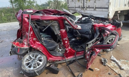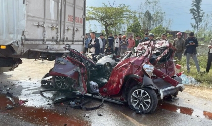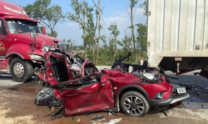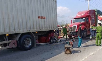 Ảnh TNGT: 4 người gặp nạn trong chiếc VinFast Fadil bị kẹp cứng giữa hai công-ten-nơ tại Hà Tĩnh