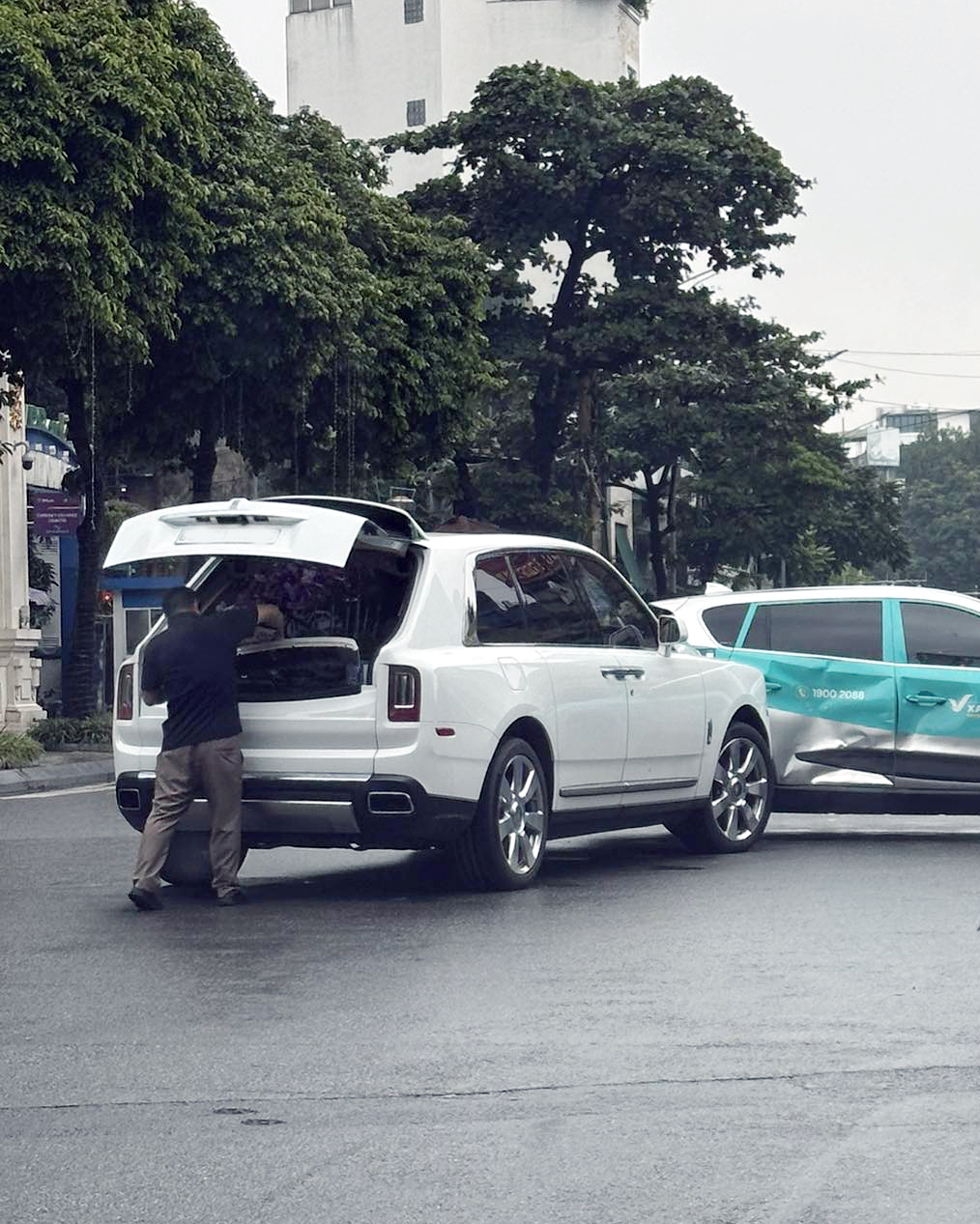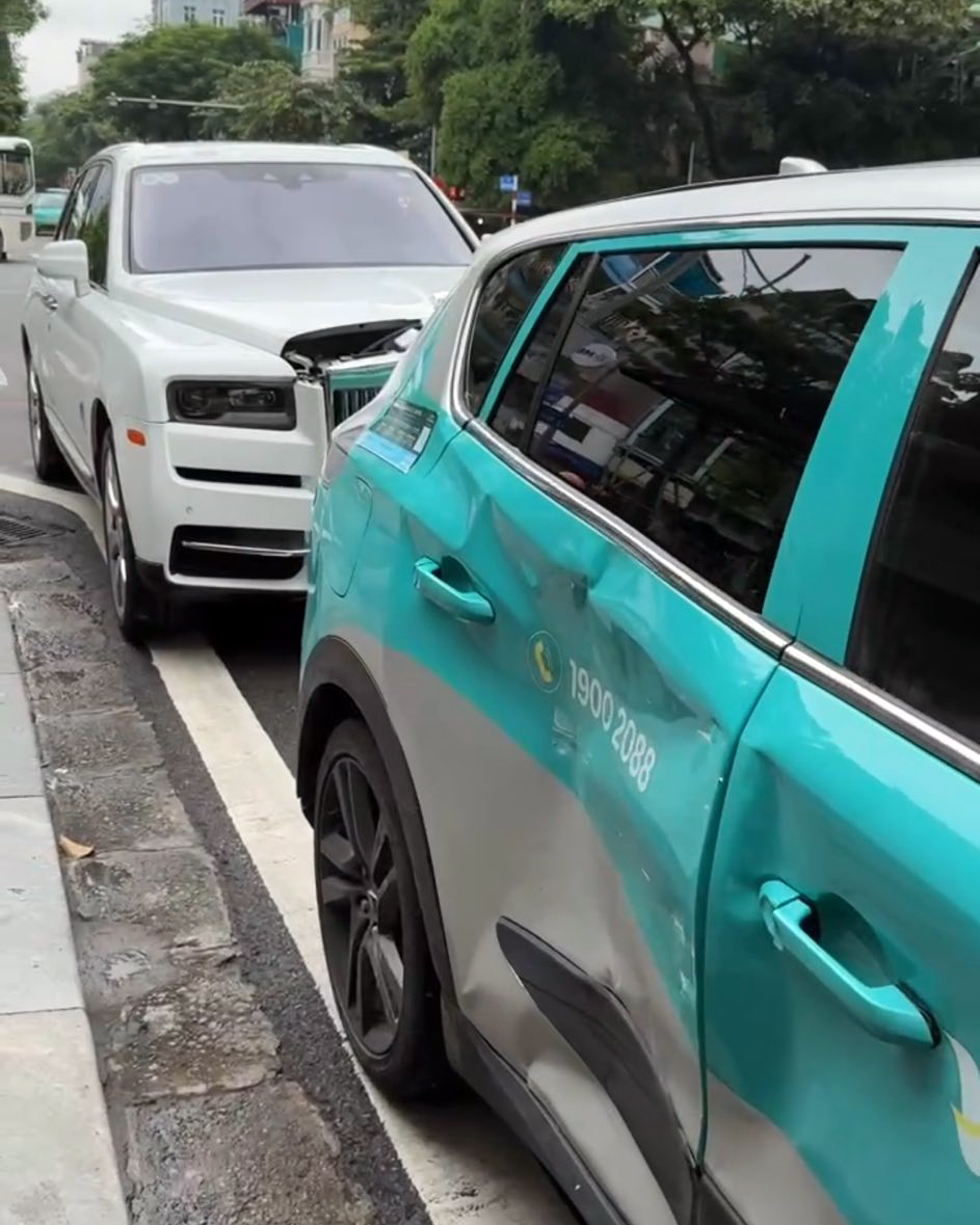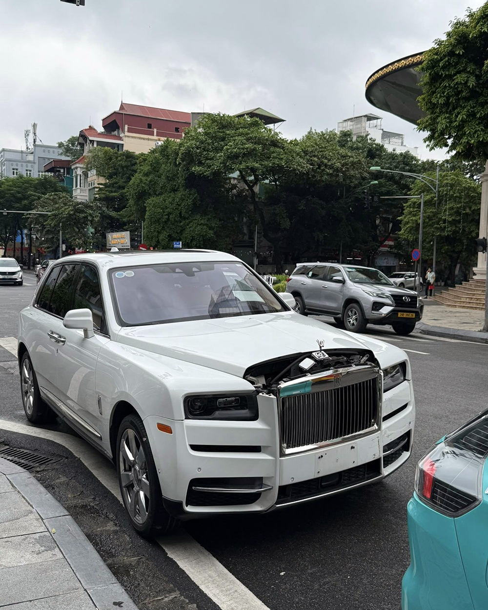 Cú đâm được coi là khá nhẹ khi chiếc Cullinan chỉ đâm móp méo bên hông chiếc xe điện và bản thân cũng bị bung ốp phía trên lưới tản nhiệt, và rất may hình như cặp đèn pha không hề hấn gì. Chiếc siêu xe SUV hạng sang này mang biển số ngoại giao.