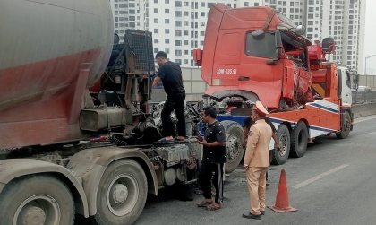 Ảnh TNGT: Hai xe đầu kéo tông nhau trên Vành đai 3 tại Hà Nội