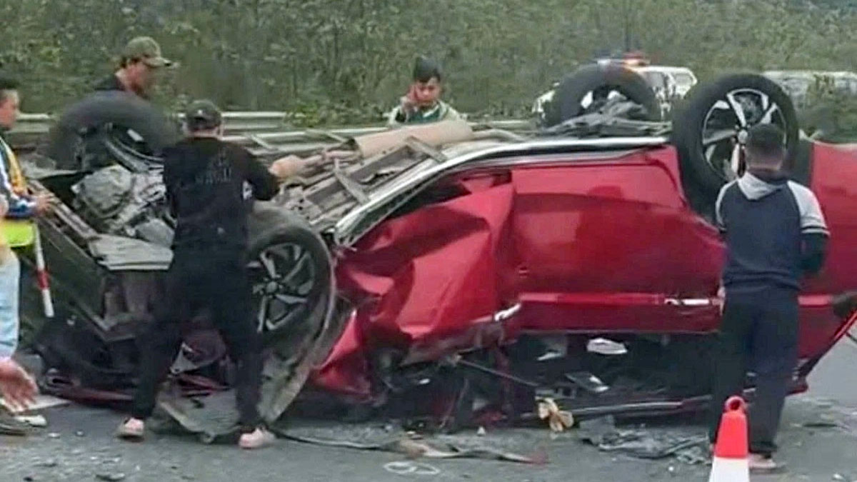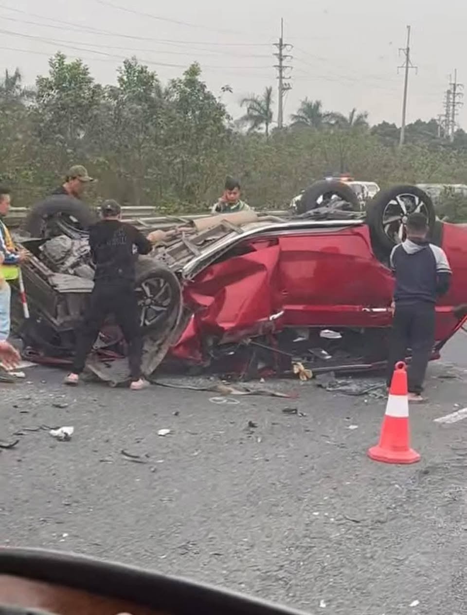 Cú va chạm mạnh khiến chiếc Xpander lộn nhiều vòng rồi lật ngửa giữa đường, thân xe biến dạng toàn bộ, nhiều mảnh vỡ văng ra mặt đường. Rất may tài xế chiếc xe này không bị nguy hiểm đến tính mạng và tự bò ra khỏi xe.