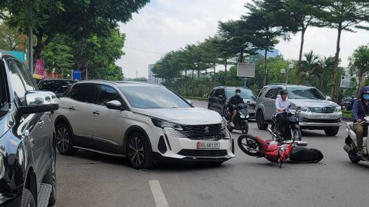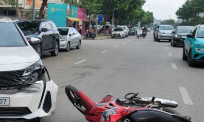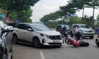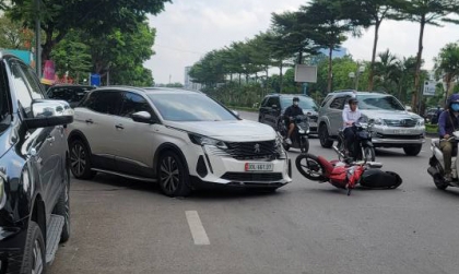Ảnh TNGẢT: Peugeot 3008 bị xe máy đâm vỡ đèn pha vì nhập làn không quan sát