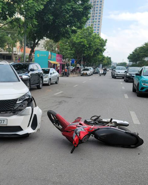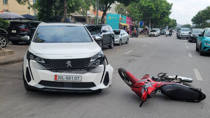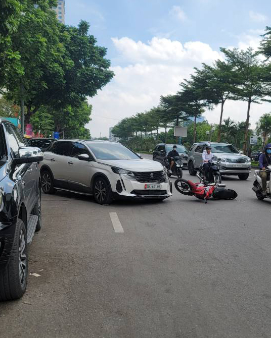 Không biết tài xế cầm lái chiếc Peugeot 3008 biển kiểm soát 30L 661.07 nhập làn từ phía bên trong có quan sát hay không nhưng đã bị một chiếc xe máy đi từ phía sau với tốc độ khá cao đâm thẳng vào đầu xe, gây vỡ đèn pha, bung cản trước.