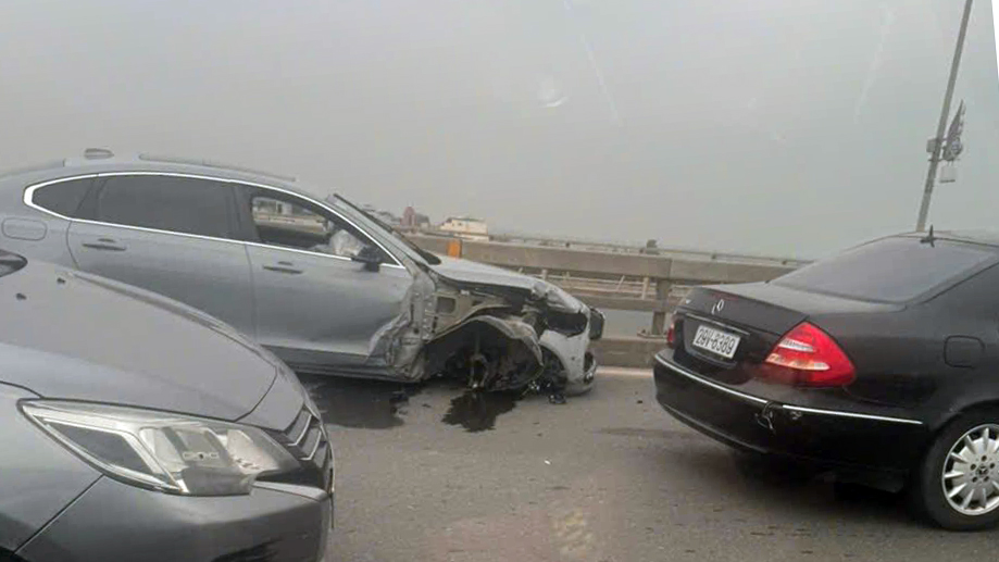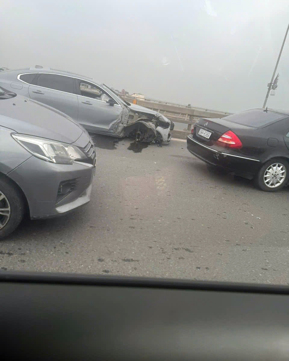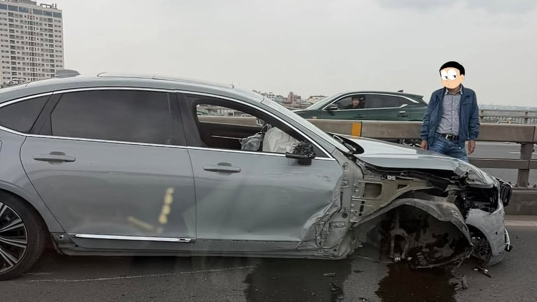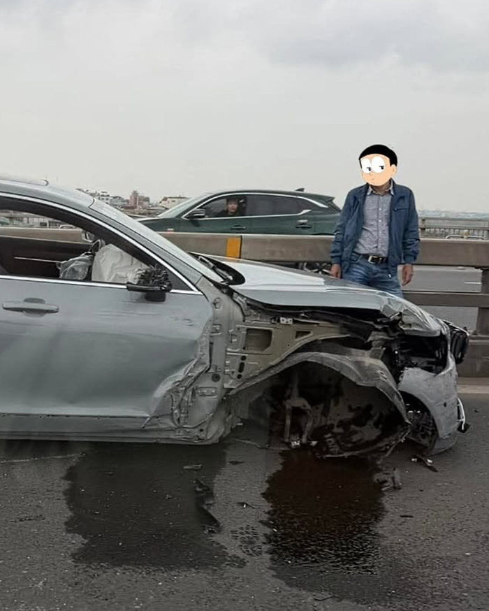 Ảnh TNGT: Volvo S90 gãy bánh trước trên cầu Nhật Tân (Hà Nội) với cú đâm về phía trước từ bên hành khách.