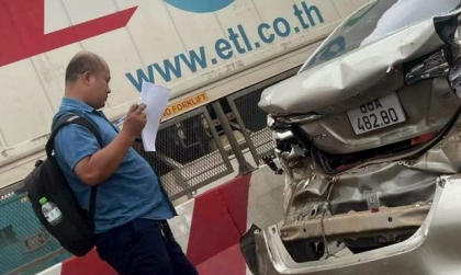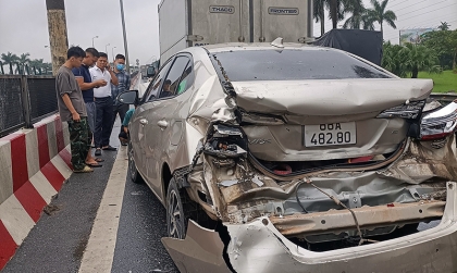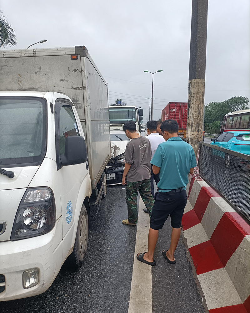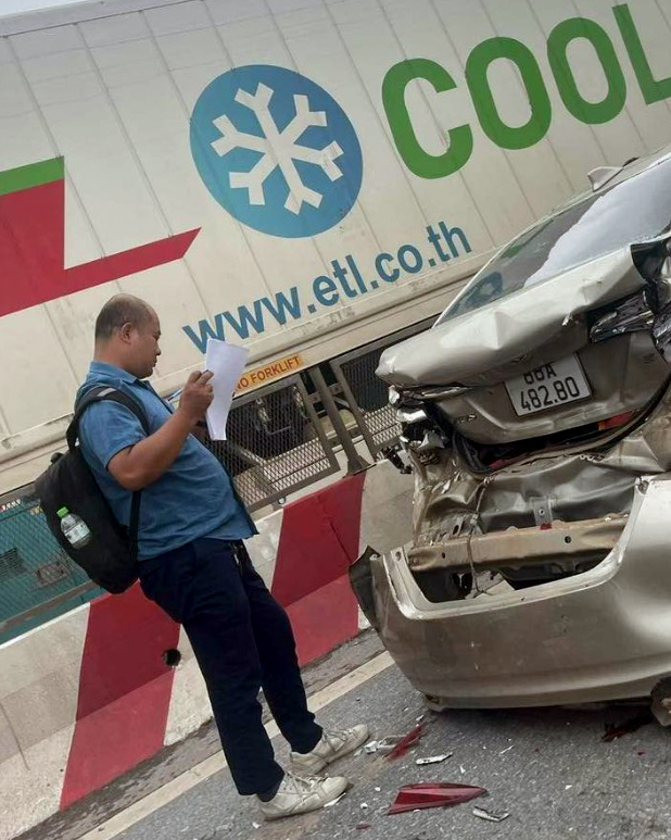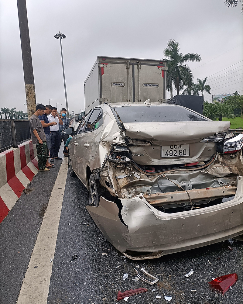 Chiếc Toyota Vios biển kiểm soát 88A 482.80 bị kẹp giữa hai chiếc hai chiếc xe tải trong một tai nạn liên hoàn do các tài xế không duy trì được khoảng cách an toàn.