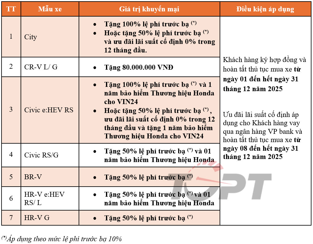 Các mẫu xe còn lại đều được nhận ưu đãi 50% lệ phí trước bạ gồm BR-V và HR-V, với phiên bản HR-V e:HEV RS và L được tặng thêm 1 năm bảo hiểm thương hiệu Honda. Theo thông báo của HVN, các khuyến mại áp dụng theo mức lệ phí trước bạ 10% cho tất cả các địa phương.