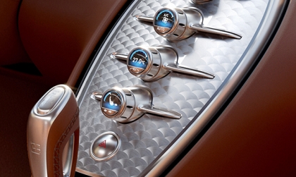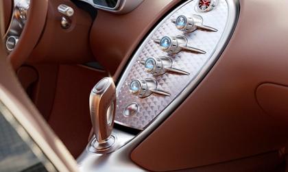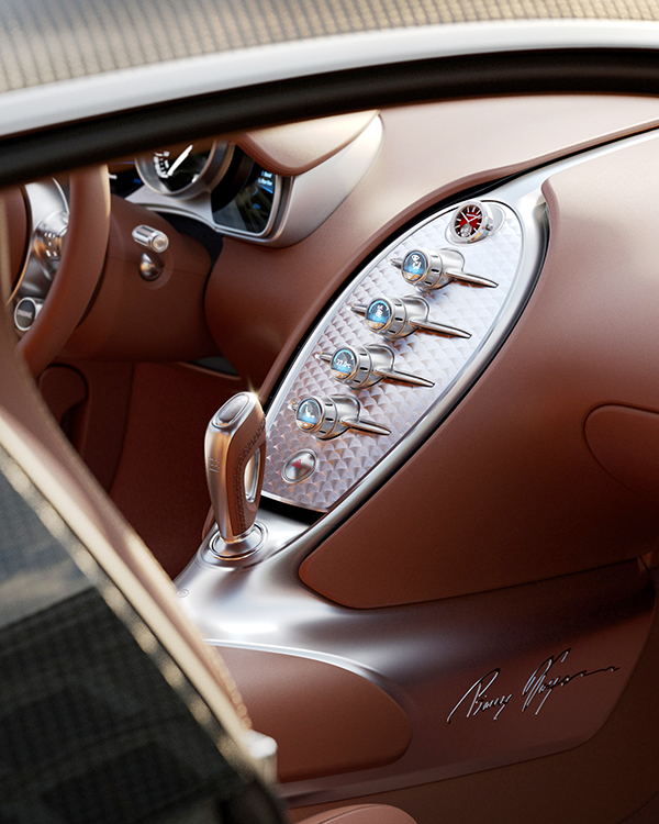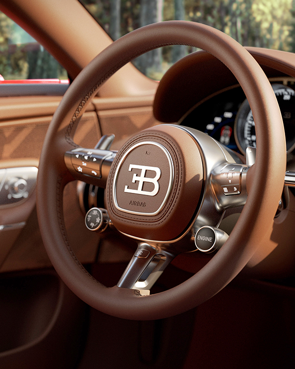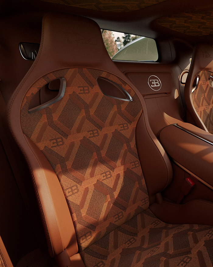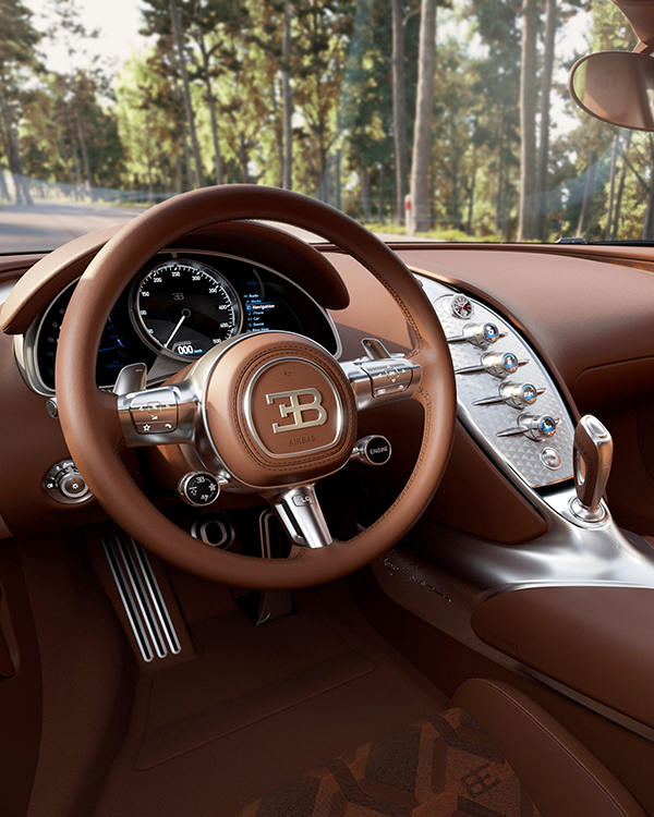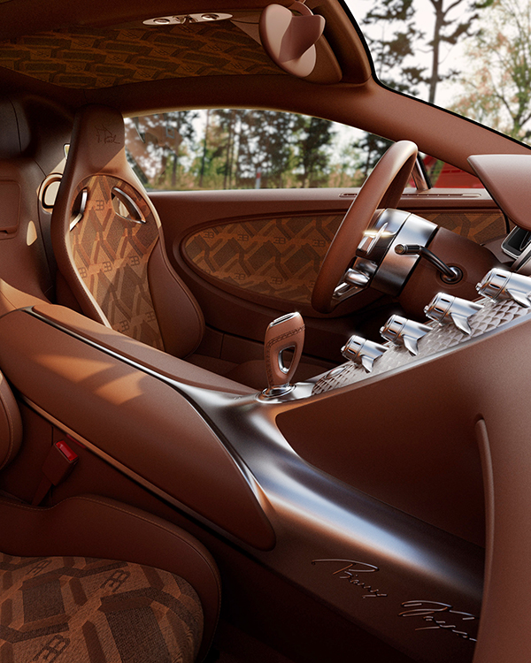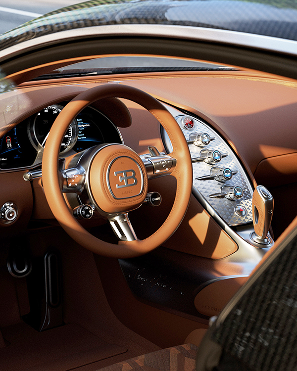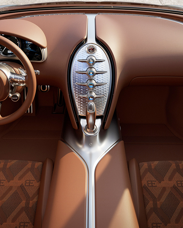 Nội thất di sản: Khoang lái bọc da màu nâu tan thủ công, kết hợp với loại vải dệt tinh xảo phong cách Hermès từ Paris. Cụm điều khiển trung tâm hình móng ngựa được hoàn thiện bằng kỹ thuật phay vân xoáy (engine-turned) – gợi nhớ đến những chiếc xe đua của Ettore Bugatti từ thế kỷ trước.