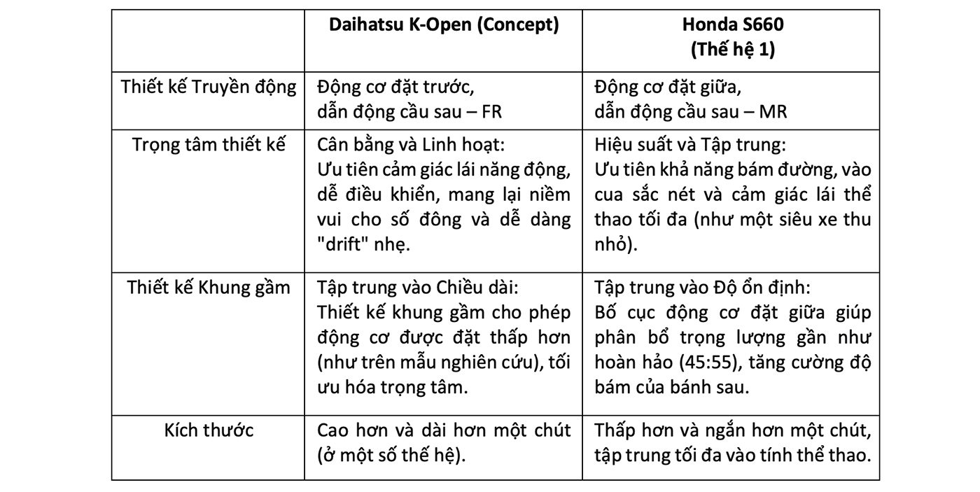 Daihatsu K-Open/Copen: Đại diện cho triết lý "Niềm vui lái xe hàng ngày". Bằng việc giữ nguyên bố cục FR (từ bỏ FF của Copen thế hệ trước) nhưng tuân thủ kích thước Kei Car, K-Open hướng tới trải nghiệm lái xe linh hoạt, dễ kiểm soát và mang lại niềm vui mui trần cho nhiều đối tượng hơn, với khả năng xoay trở tốt hơn trong đô thị (bán kính vòng quay nhỏ hơn S660).
