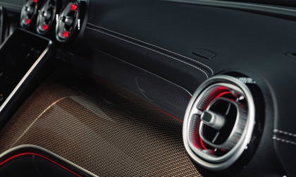- Nội thất bọc da cao cấp với chỉ khâu màu beige và các tấm ốp sợi carbon đan sợi kim loại bắt mắt.
