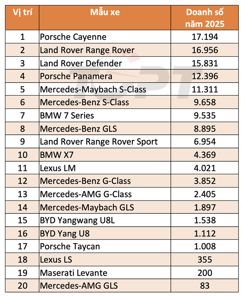 Yangwang – thương hiệu con của BYD chuyên xe năng lượng mới là thương hiệu Trung Quốc duy nhất có mặt trong danh sách này. Mẫu Yangwang U8L xếp thứ 15 với 1.538 chiếc bán ra, và Yangwang U8 xếp thứ 16 với 1.112 chiếc bán ra.