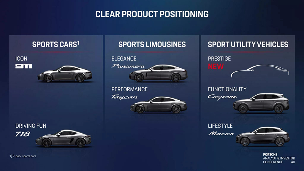 Một trong những thay đổi lớn nhất là mẫu SUV siêu sang có tên mã K1, được định vị cao hơn Cayenne. Ban đầu, mẫu xe này chỉ được lên kế hoạch chạy điện hoàn toàn, nhưng giờ đây sẽ được ra mắt với tùy chọn động cơ đốt trong và hybrid sạc điện (PHEV). Tương tự, các dòng xe xăng như Panamera và Cayenne sẽ tiếp tục sử dụng động cơ đốt trong và hybrid đến những năm 2030.