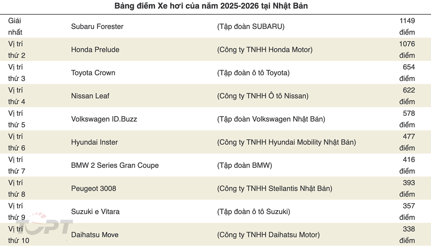 Danh sách top 10 mẫu xe và điểm số trong giải thưởng Japan Car of The Year 2025-2026:
