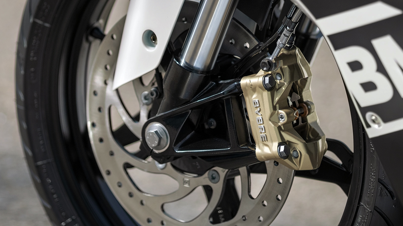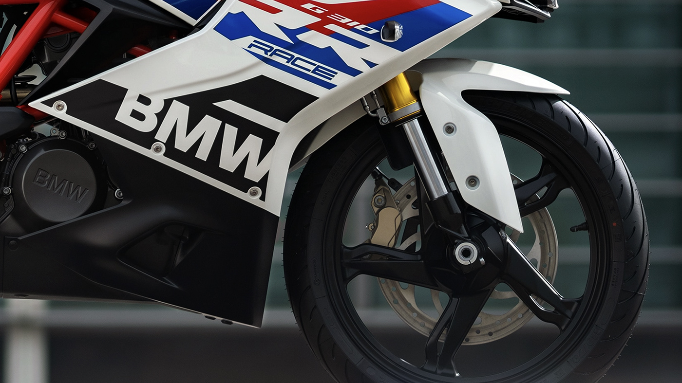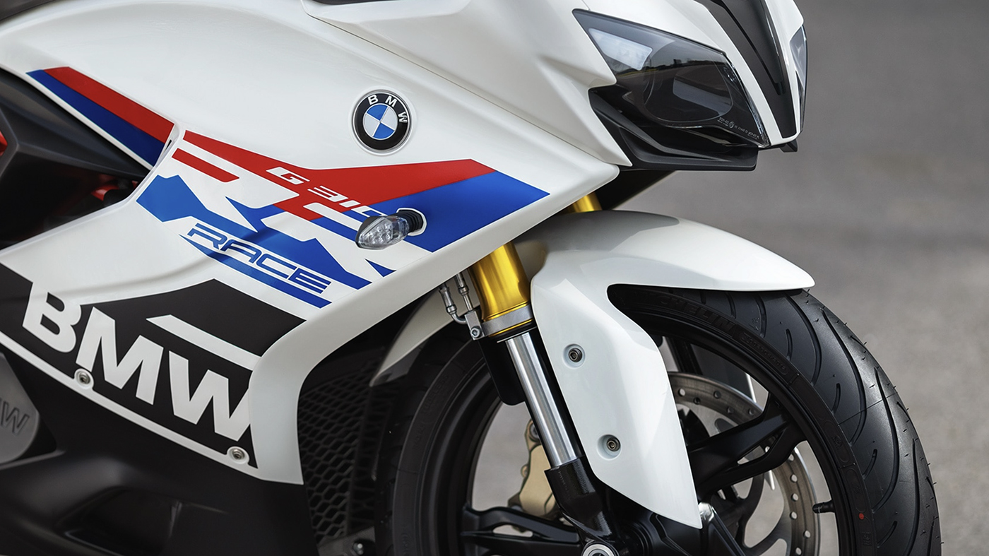 Phiên bản Giới hạn mới của G 310 RR sở hữu ngôn ngữ thiết kế thể thao lấy cảm hứng từ đàn anh S 1000 RR, nổi bật với bộ tem đua thể thao, logo đánh số từ 1 đến 310 cùng bộ quây gió hoàn chỉnh mang tính khí động học. Chiếc xe được trang bị phuộc trước hành trình ngược (Upside-đơn) màu vàng nổi bật, gắp sau (càng sau) bằng nhôm (aluminum swingarm) và lốp Michelin Pilot Street, đảm bảo khả năng xử lý chính xác và độ bám đường tốt.