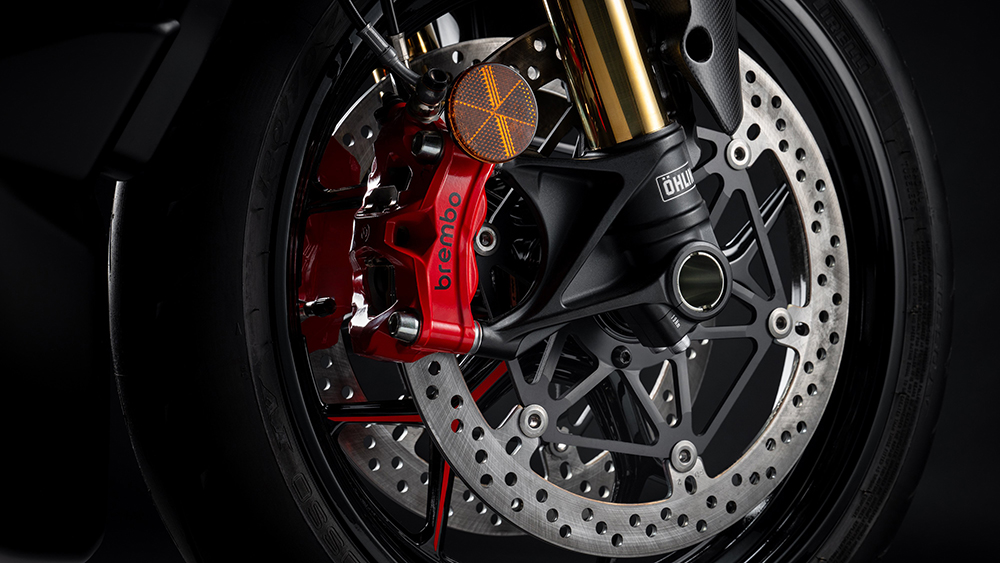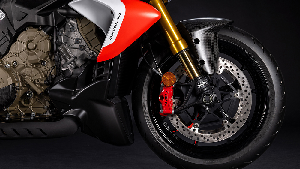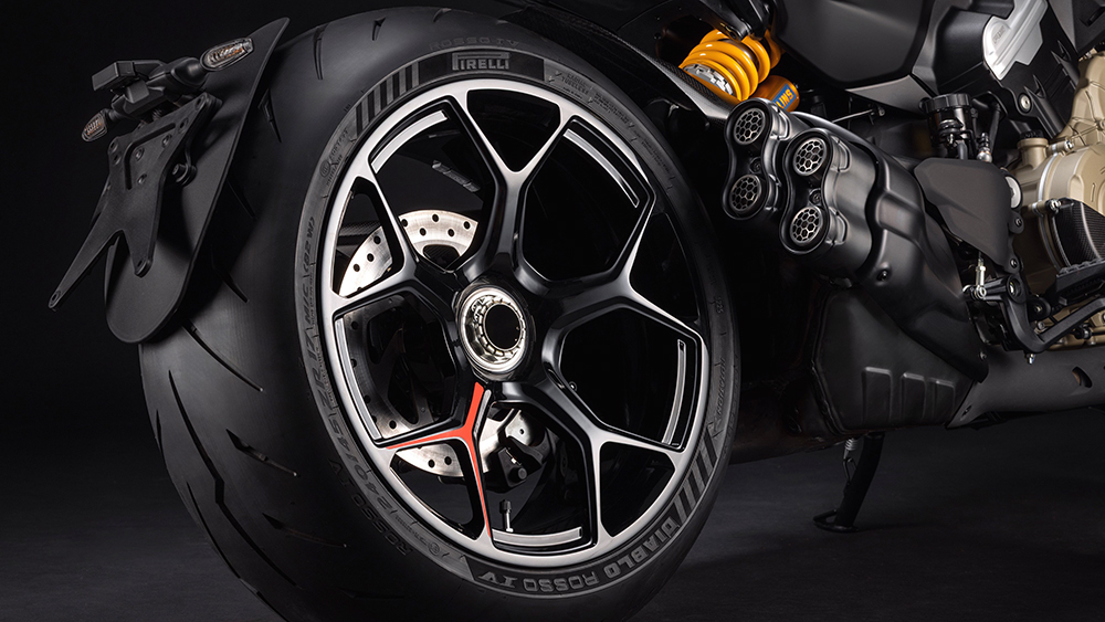 Một số chi tiết thiết kế đáng quan tâm khác trên Ducati Diavel V4 RS bao gồm bộ lốp Diablo Rosso IV mới của Pirelli, có kích thước 240/45, hệ thống treo Ohlins dạng upside-down NIX30 đường kính 48mm ở phía trước và giảm xóc đơn STX46 ở phía sau. Hệ thống phanh của Diavel V4 RS được kế thừa trực tiếp từ Panigale V4, với đĩa phanh đường kính 330mm và kẹp phanh Brembo Stylema monobloc ở phía trước, cùng đĩa phanh đơn 265 mm được kẹp bởi kẹp phanh Brembo nổi ở phía sau.