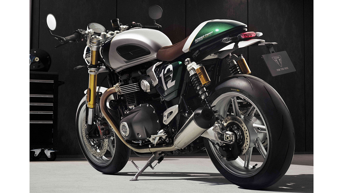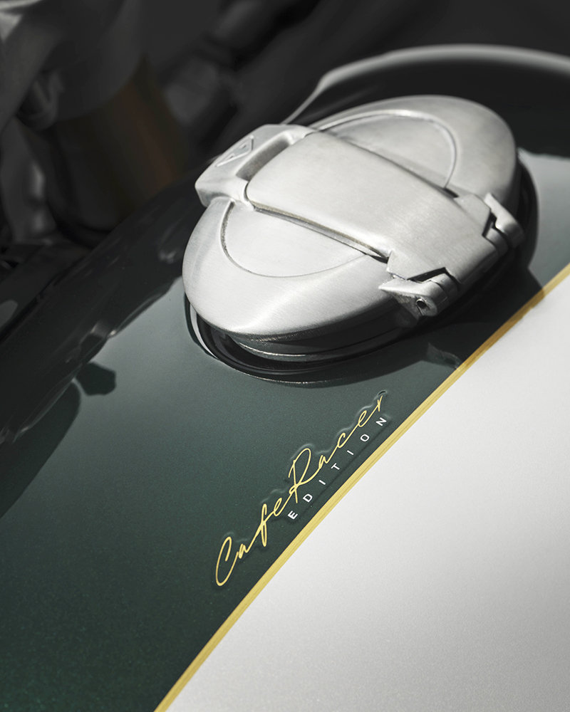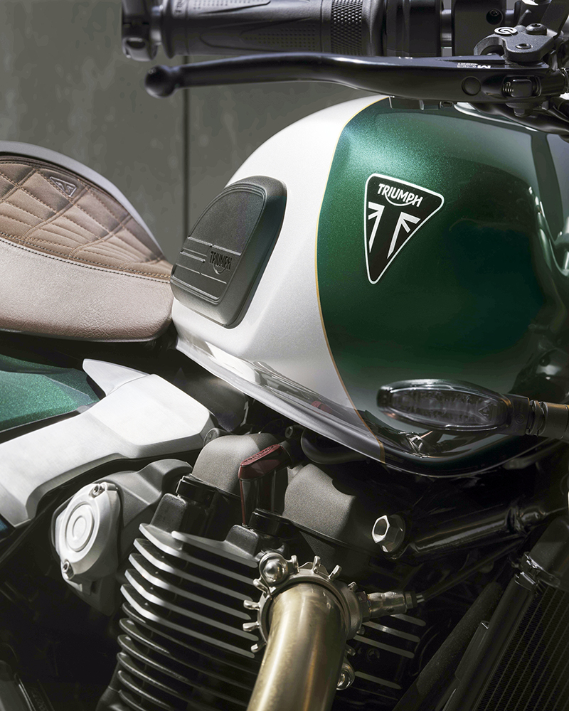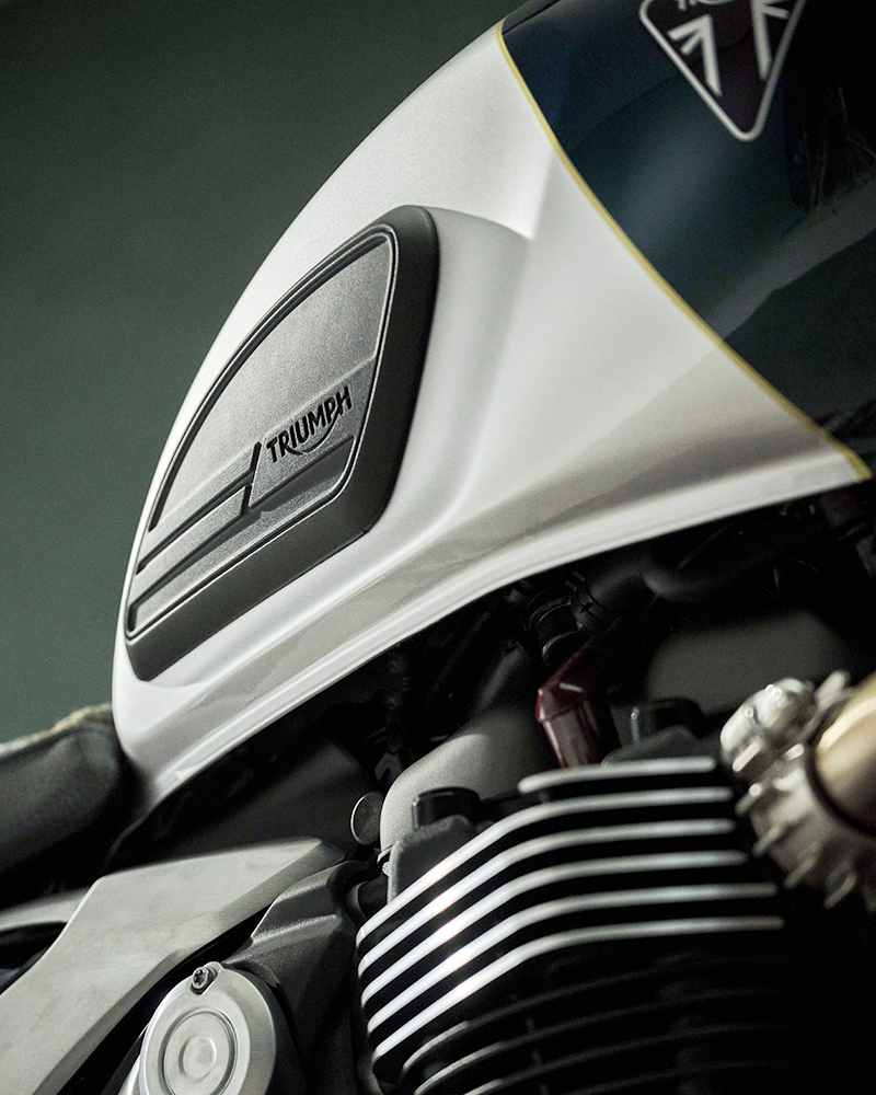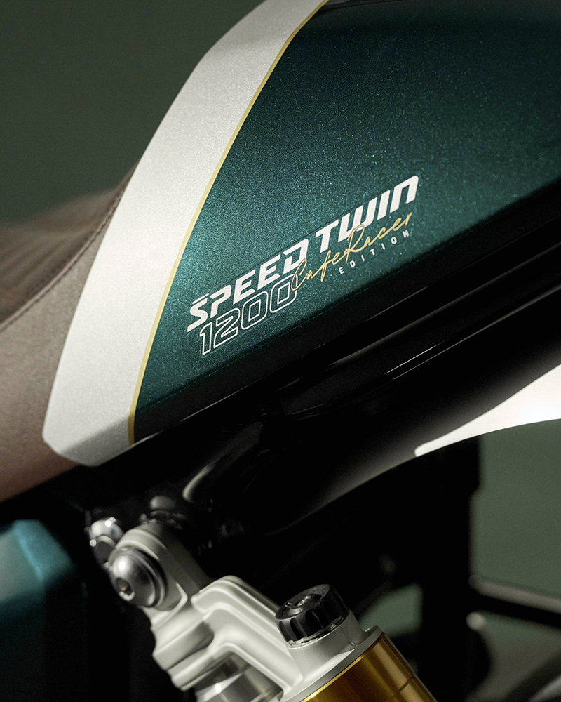 Dựa trên nền tảng của bản "hiệu năng cao" Speed Twin 1200 RS, phiên bản Cafe Racer gây ấn tượng mạnh với phối màu Competition Green (Xanh đua) kết hợp Aluminium Silver (Bạc nhôm) và đường chỉ vàng Empire Gold thủ công.
