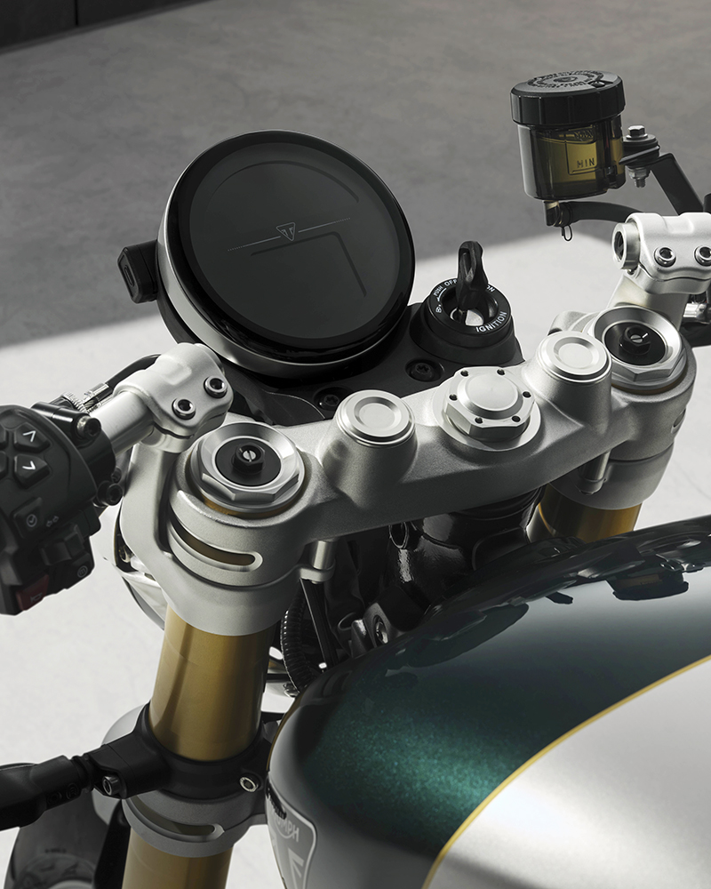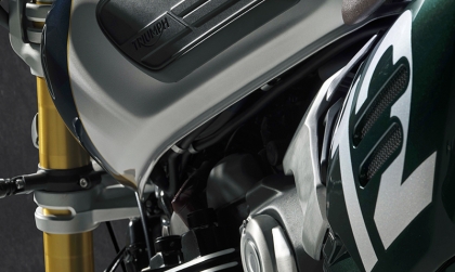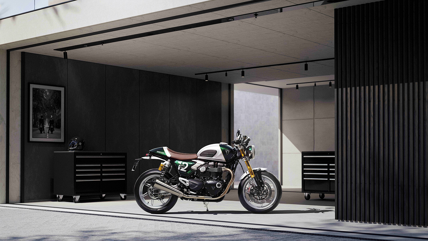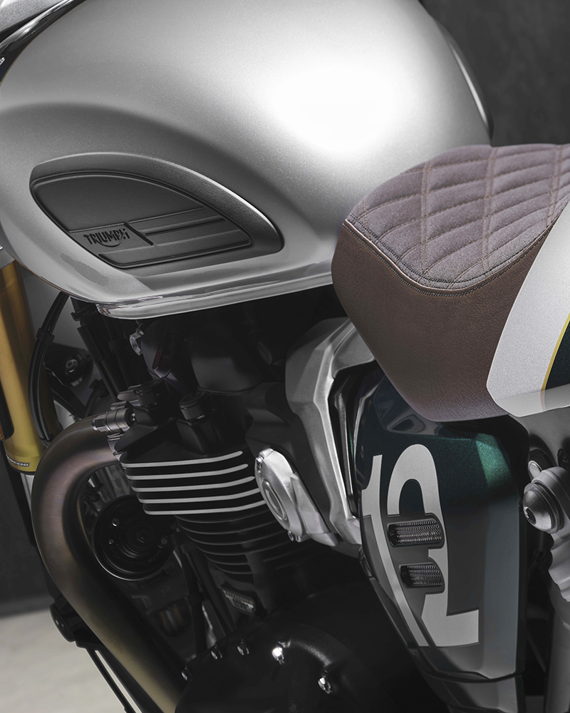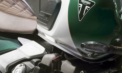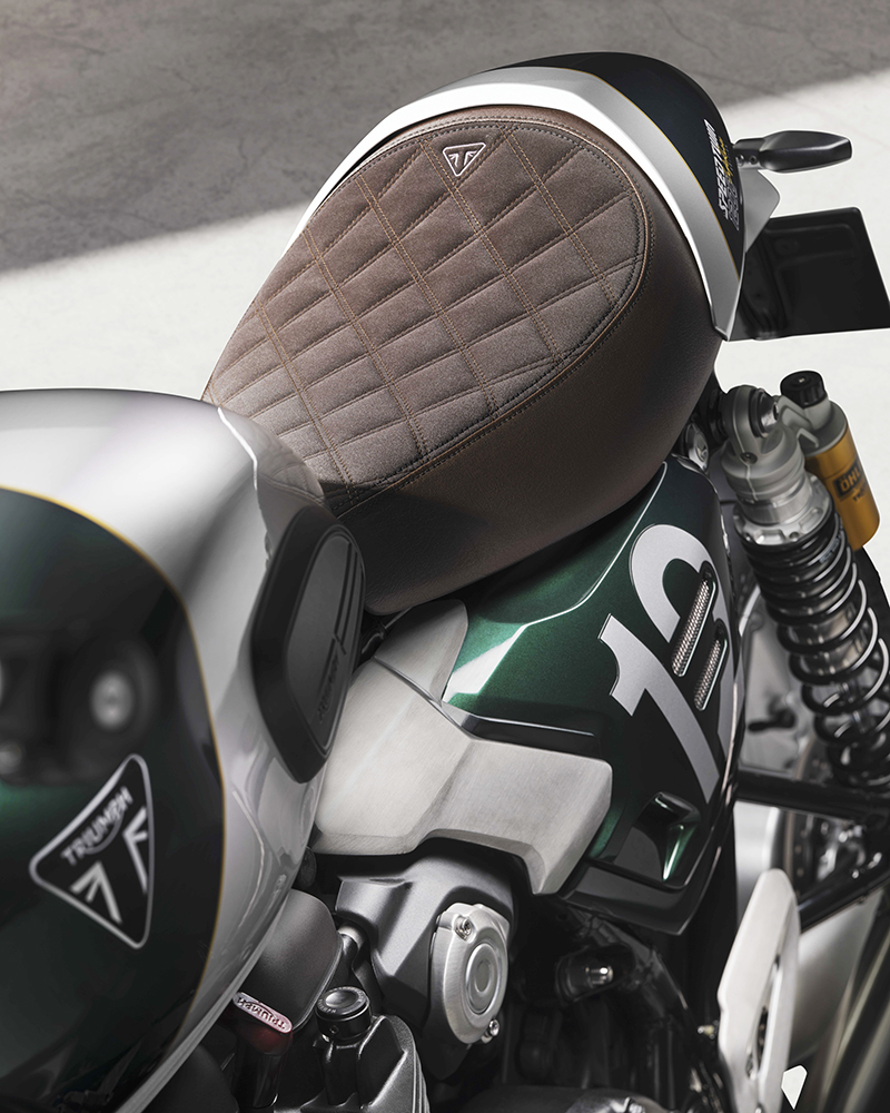 Dựa trên nền tảng của bản "hiệu năng cao" Speed Twin 1200 RS, phiên bản Cafe Racer gây ấn tượng mạnh với phối màu Competition Green (Xanh đua) kết hợp Aluminium Silver (Bạc nhôm) và đường chỉ vàng Empire Gold thủ công.