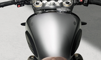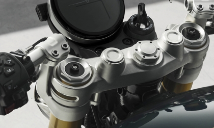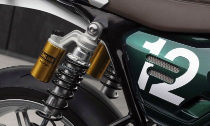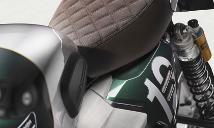 Diện mạo tay đua: Xe được trang bị ghi-đông clip-on thấp, yên xe phong cách Clubman bọc da nâu tạo tư thế ngồi núp gió đặc trưng.