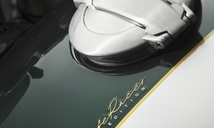 Chi tiết độc bản: Ốp đèn pha cùng màu xanh, gác chân sau được tháo rời (nhưng vẫn tặng kèm trong hộp), gương gù tay lái tiện CNC và nắp máy kiểu xương cá. Tấm ốp hông xe nổi bật với con số "12" bạc trên nền xanh lục.
