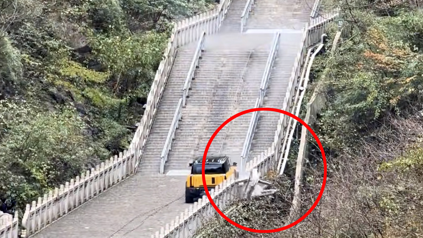 Vụ việc xảy ra vào khoảng trưa ngày 12 tháng 11. Các nhân chứng cho biết họ nhìn thấy chiếc xe không thể leo lên cầu thang, sau đó trượt ngược lại và làm gãy một đoạn lan can. "Nó nằm im đó suốt hai giờ đồng hồ mà không di chuyển", một cư dân mạng tại hiện trường chia sẻ với Jimu News . Một hướng dẫn viên du lịch địa phương xác nhận rằng "Cầu thang Thiên đường" đã đóng cửa đón khách du lịch vào cả ngày 12 và 13 tháng 11 để phục vụ sự kiện Chery.