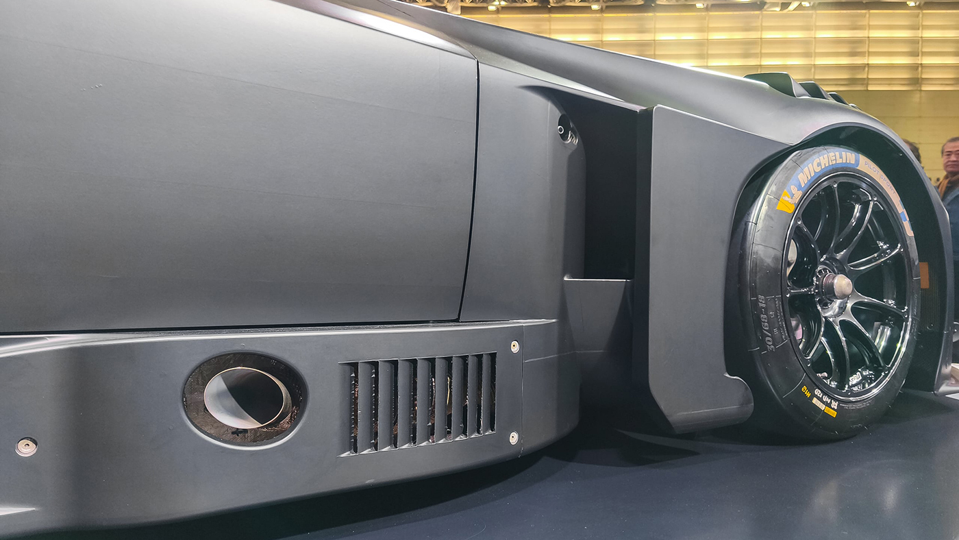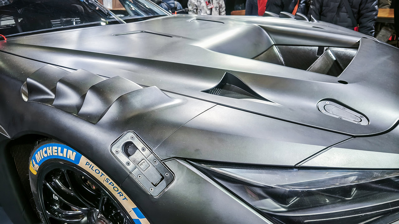GR GT3 sở hữu thiết kế thân xe hầm hố hơn nhiều dành cho đường đua, trong khi ống xả đặt ngay bên dưới mỗi cánh cửa. Hệ thống phanh Brembo được đặt phía sau bộ mâm hợp kim Rays 18 inch, với lốp có kích thước 30/68-18 ở phía trước và 31/71-18 ở phía sau. Bên trong, khoang cabin được tối giản của GR GT3 được trang bị vô lăng, bảng điều khiển và hai màn hình hiển thị dữ liệu chuyên dụng cho đường đua.