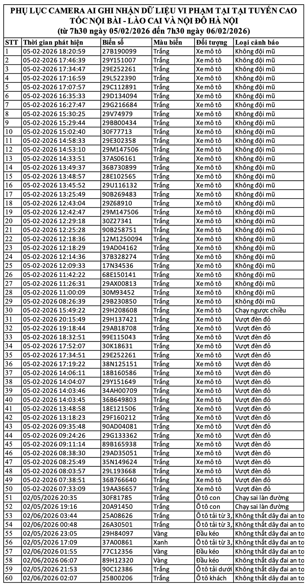 Danh sách các phương tiện giao thông được camera AI phát hiện vi phạm giao thông tại nội đô Hà Nội và cao tốc Nội Bài - Lào Cai ngày 6/2/2026.