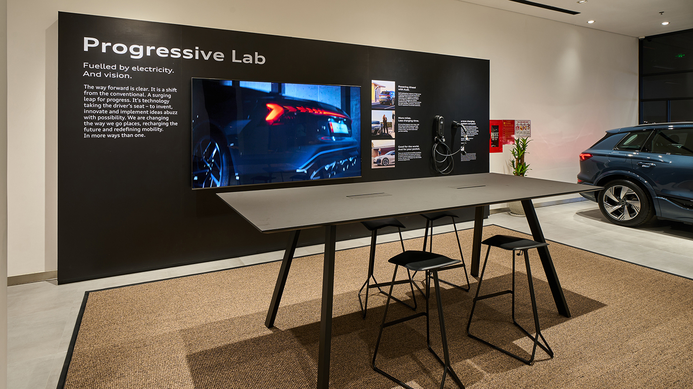 Mô hình Progressive Showroom Concept của Audi được xây dựng dựa trên cấu trúc tám mô-đun, nhằm mang đến cho mỗi khách hàng và khách tham quan một hành trình trải nghiệm được cá nhân hóa hoàn toàn ngay trong không gian showroom, từ đó tạo nên một trải nghiệm cao cấp, trọn vẹn với thương hiệu và sản phẩm Audi.