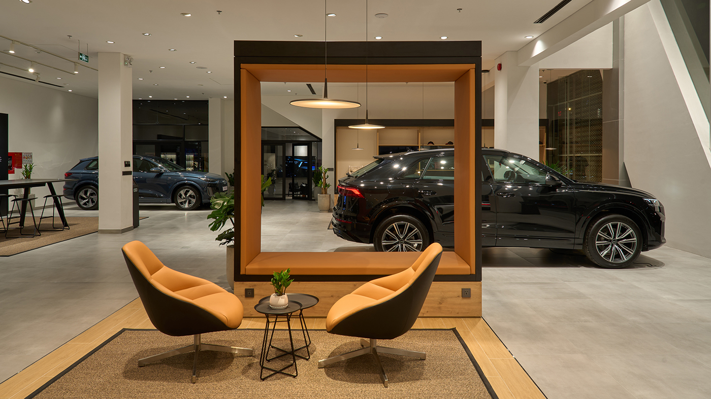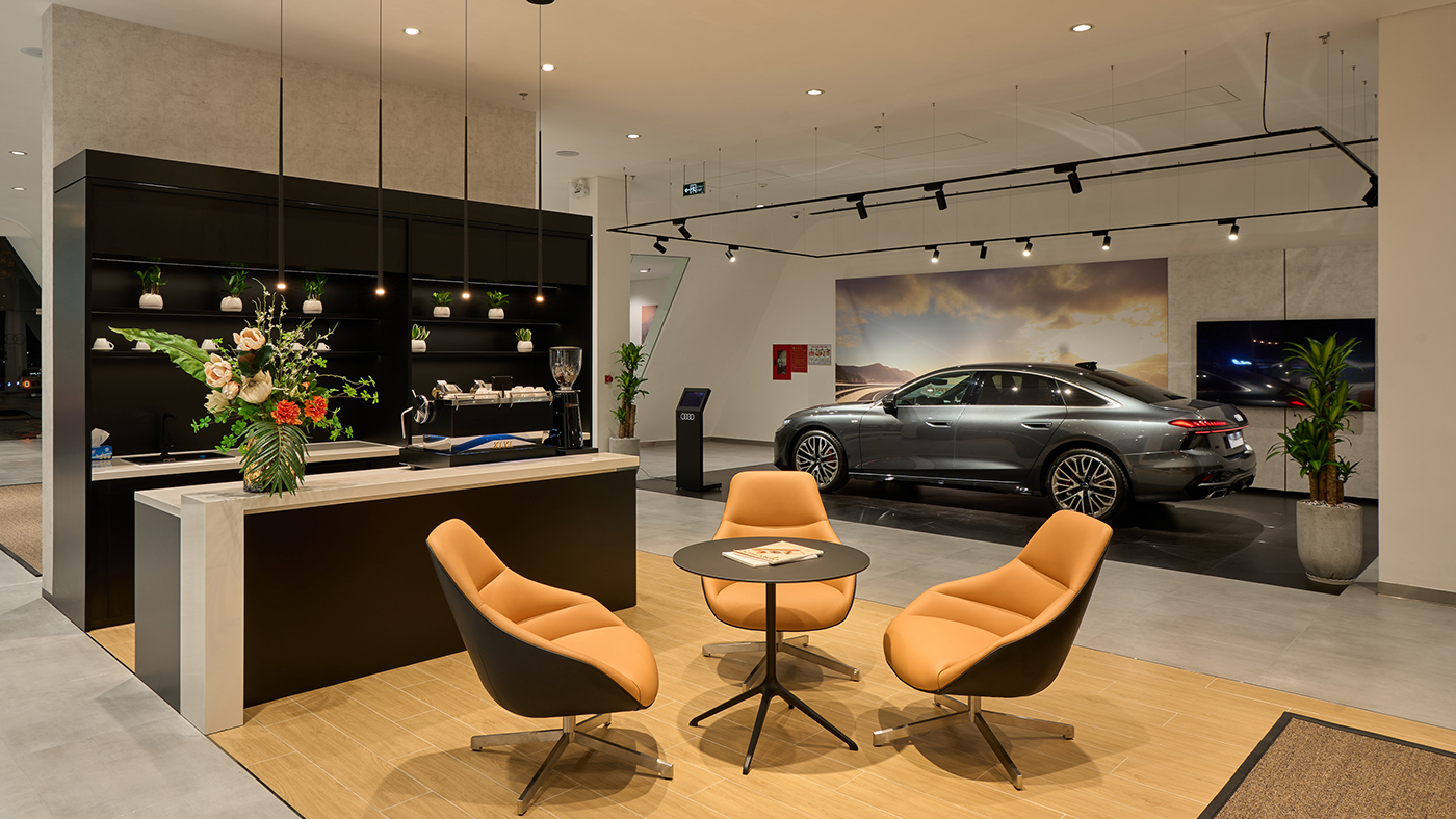 Không gian bắt đầu từ khu tiếp đón trung tâm – nơi khách hàng được chào đón một cách riêng biệt và được tìm hiểu kỹ lưỡng về mục đích chuyến thăm, tiếp nối là quầy cà phê trang bị máy pha cà phê Ý cao cấp cùng khu khách chờ thoải mái với không gian làm việc và cà phê barista dành riêng cho khách hàng. Ở vị trí trung tâm showroom là khu trưng bày, nơi một mẫu xe Audi được bố trí làm điểm nhấn thị giác ấn tượng, liền kề với khu công nghệ chuyên giới thiệu và giải thích sâu các công nghệ đặc trưng của thương hiệu.