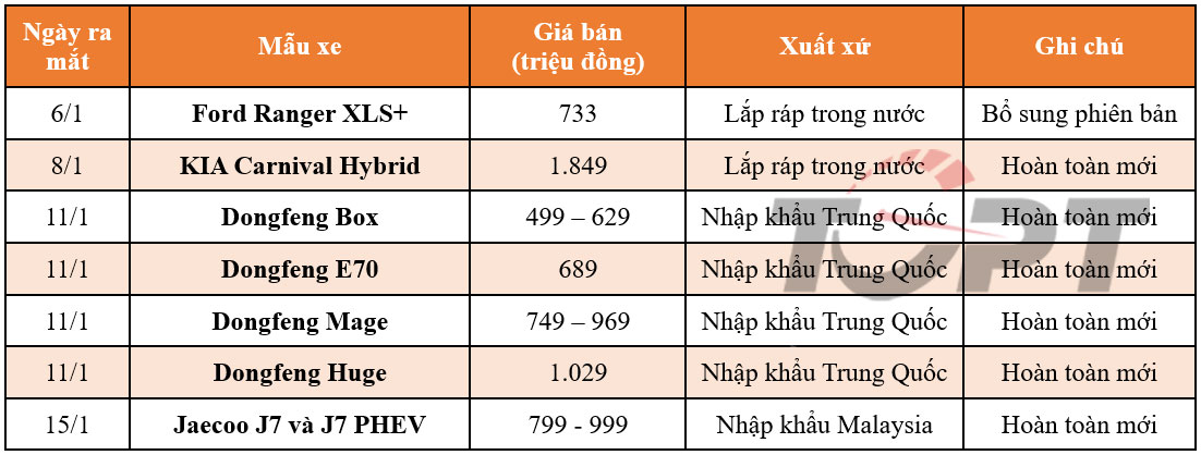 Trong tháng đầu năm, thị trường ô tô Việt Nam đón nhận loạt xe Trung Quốc gia nhập mạnh mẽ từ thương hiệu Dongfeng và Jaecoo. Màn ra mắt với 4 mẫu xe cùng lúc không khiến Dongfeng nổi bật khi số lượng đại lý quá thấp, trong khi Jaecoo đang song hành cùng Omoda để có những bước tiến chậm với nhiều sản phẩm mới ra mắt trong năm 2025. Ngoài ra, tháng này còn có sự xuất hiện của KIA Carnival Hybrid hoàn toàn mới, bổ sung vào dải sản phẩm xe lai của KIA, cùng với đó là phiên bản XLS+ tầm trung của Ford Ranger.