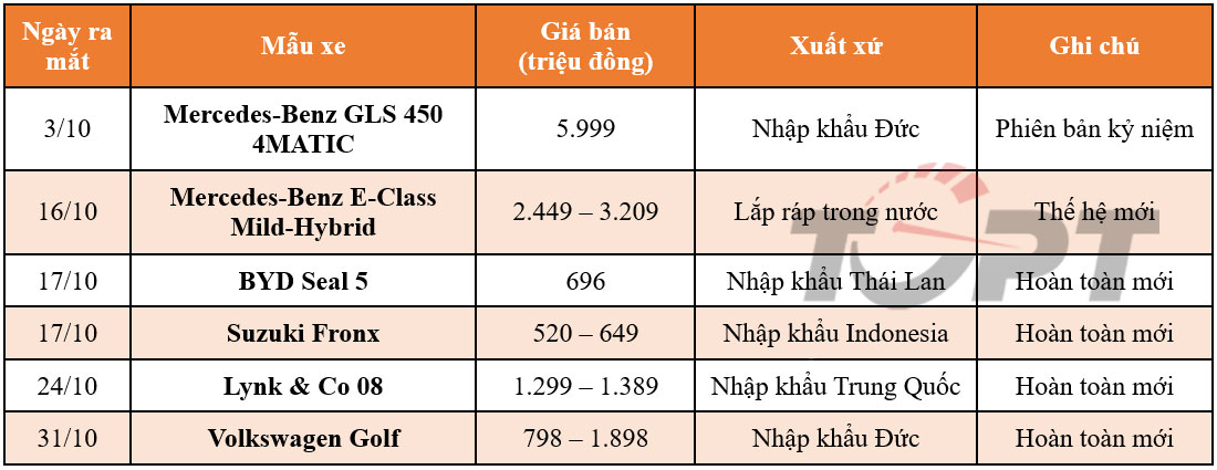 Mercedes-Benz Việt Nam cũng kỷ niệm 30 năm với phiên bản đặc biệt của mẫu GLS 450 4MATIC ra mắt ngay đầu tháng 10, và đến giữa tháng, hãng tiếp tục giới thiệu thế hệ mới của E-Class với hệ thống Mild-Hybrid. Ngoài ra, thị trường Việt Nam đón nhận 4 mẫu xe hoàn toàn mới khác trong tháng, đến từ các thương hiệu Trung Quốc, Nhật Bản và Đức.