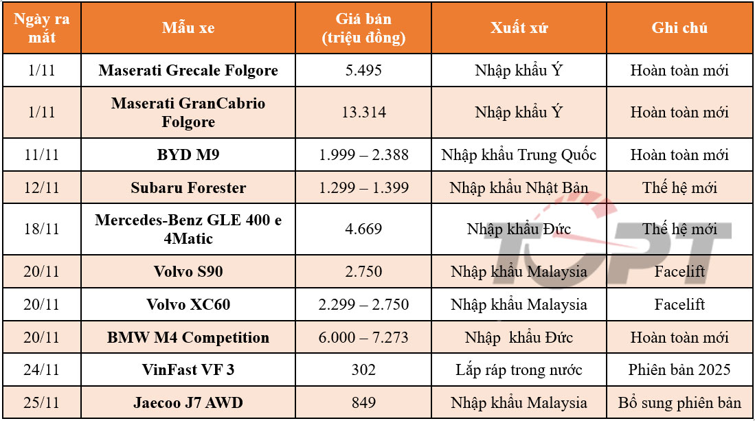 Trong tháng 11, thị trường trong nước có thêm loạt xe mới gia nhập, với bộ đôi Folgore của Maserati, cùng với mẫu xe BYD M9 hoàn toàn mới, trong khi Subaru Forester và Mercedes-Benz GLE được bổ sung thế hệ mới. NGoài ra, tháng này cũng có một số mẫu xe đáng chú ý khác, như bộ đôi S90 và XC60 được nâng cấp giữa vòng đời, BMW M4 Competition được nhập khẩu để cạnh tranh trong phân khúc xe thể thao...