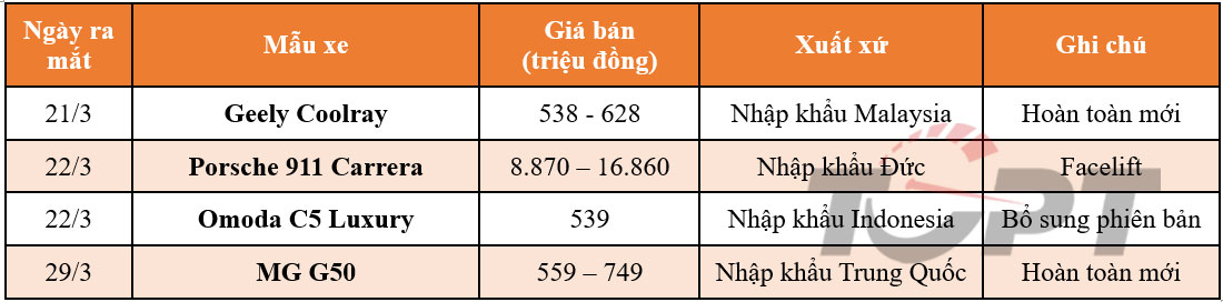 Trong tháng 3, thị trường sôi động hơn với 3 mẫu xe Trung Quốc bất ngờ lộ diện nhưng có xuất xứ từ nhiều nước khác nhau, mang đến sự cạnh tranh mạnh mẽ ở các phân khúc SUV đô thị và MPV giá rẻ. Đáng chú ý nhất trong tháng này là mẫu Porsche 911 Carrera mạnh mẽ, tạo nên sự sôi động trong phân khúc xe thể thao.