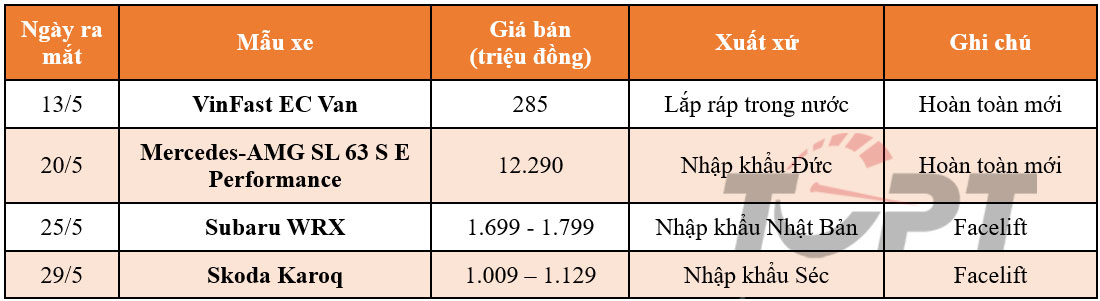 Khi thị trường bước vào giai đoạn chậm nhất năm, các hãng xe không quá tích cực ra mắt các xe mới trong tháng 5, dáng chú ý nhất có VinFast EC Van - mẫu xe điện chuyên phục vụ cho giới vận chuyển hàng hóa, trong khi mẫu SL 63 của Mercedes-AMG vốn đã được thông báo từ năm 2024 nhưng đến 2025 mới chính thức được ra mắt. Ngoài ra, tháng này còn có mẫu Skoda Karoq được nâng cấp giữa vòng đời, trong khi Subaru WRX lại có sự xuất hiện đầy âm thầm tại Việt Nam.