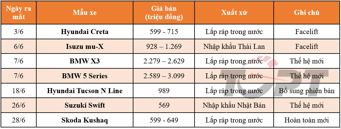 Trong tháng 6, thị trường Việt Nam đón nhận duy nhất một mẫu xe mới mẻ, đó là Skoda Kushaq được lắp ráp trong nước và cạnh tranh trong phân khúc SUV đô thị, cùng với màn trở lại của Suzuki Swift sau hơn 1 năm ngừng bán. Cùng với đó, tháng này có bộ đôi X3 và 5 Series thế hệ mới được giới thiệu chính thức trong khi các mẫu xe Hyundai Creta và Isuzu mu-X được nâng cấp giữa vòng đời.
