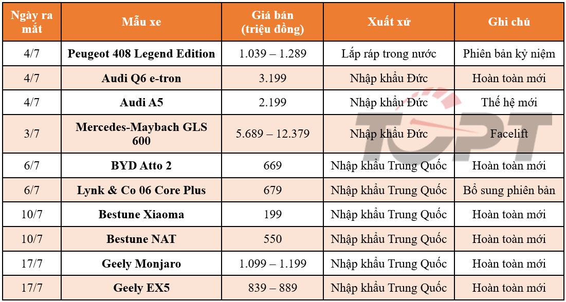 Những ngày đầu tháng 7 là sự xuất hiện của hàng loạt mẫu xe châu Âu với nhiều thương hiệu khác nhau, đáng chú ý có phiên bản Peugeot 408 Legend Edition kỷ niệm 215 năm thành lập của thương hiệu này. Trong khi đó, những ngày còn lại chỉ gồm các mẫu xe Trung Quốc, với Bestune là thương hiệu mới mẻ xuất hiện, cùng với đó là bộ đôi Monjaro và EX5 của Geely, BYD Atto 2 và phiên bản tiêu chuẩn Lynk & CO 06 Core Plus.