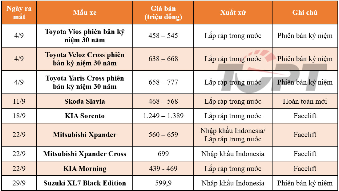 Trong tháng 9, nhiều phiên bản kỷ niệm của các mẫu xe khác nhau đã xuất hiện tại Việt Nam, với bộ ba Vios, Veloz Cross và Yaris Cross của Toyota, cùng với mẫu Suzuki XL7 Black Edition; tất cả các xe này đều đánh dấu 30 năm của thương hiệu Toyota và Suzuki tại Việt Nam. Cùng với đó, Skoda cũng ra mắt mẫu ô tô lắp ráp trong nước thứ hai với tên gọi Slavia, KIA tung ra bộ đôi facelift mới cho Sorento và Morning, trong khi Mitsubishi Xpander và Xpander Cross tiếp tục được nâng cấp nhẹ.