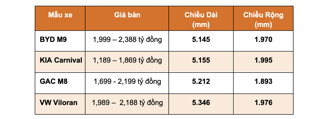 Tại Việt Nam, BYD M9 sẽ phải cạnh tranh với các đối thủ đã thành danh trước đó như KIA Carnival, GAC M8 và cả Volkswagen Viloran.