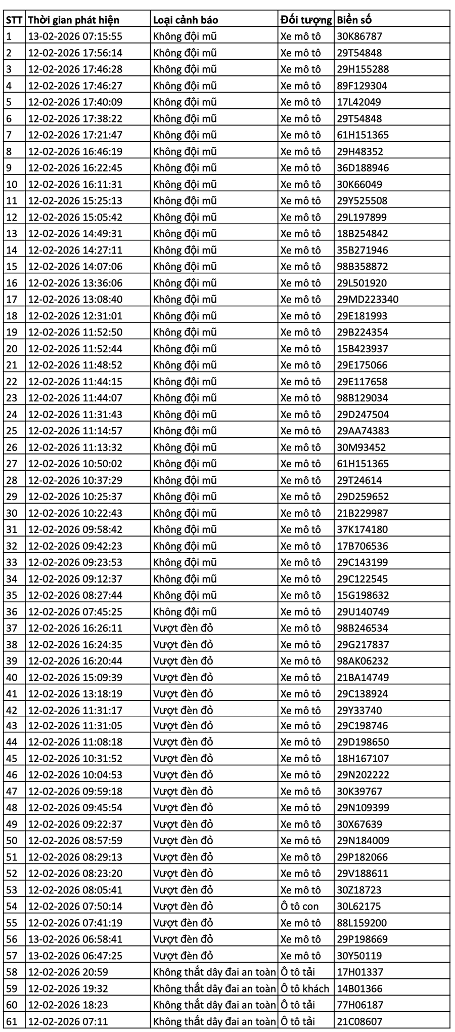 Trong danh sách này, các lỗi được hệ thống camera AI ghi nhận bao gồm: