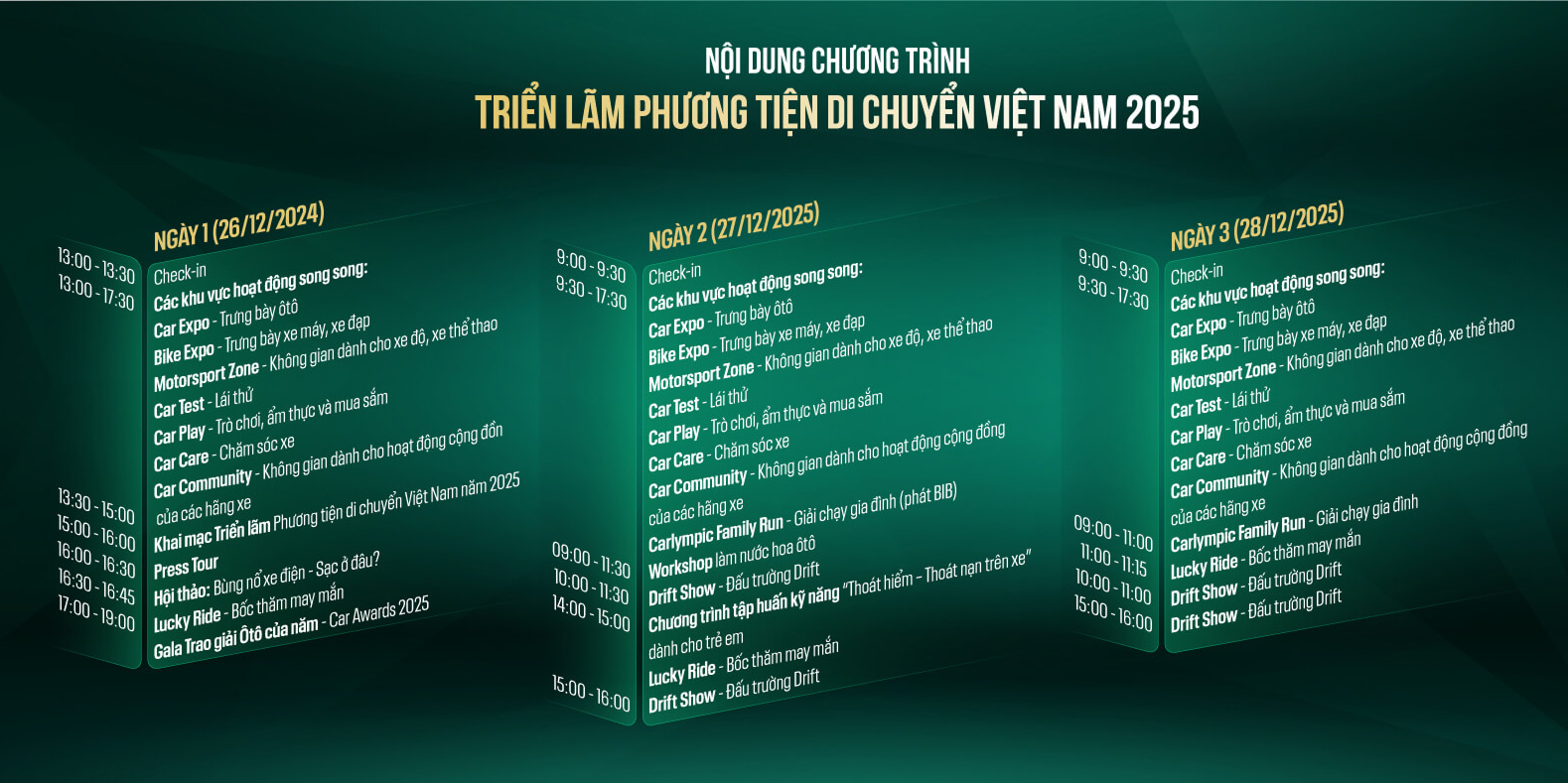 Trong khuôn khổ Triển lãm, Gala Trao giải Ô tô của năm 2025 sẽ được tổ chức nhằm công bố và vinh danh những mẫu xe xuất sắc nhất năm, dựa trên đánh giá của hội đồng chuyên môn và bình chọn từ cộng đồng người tiêu dùng.
