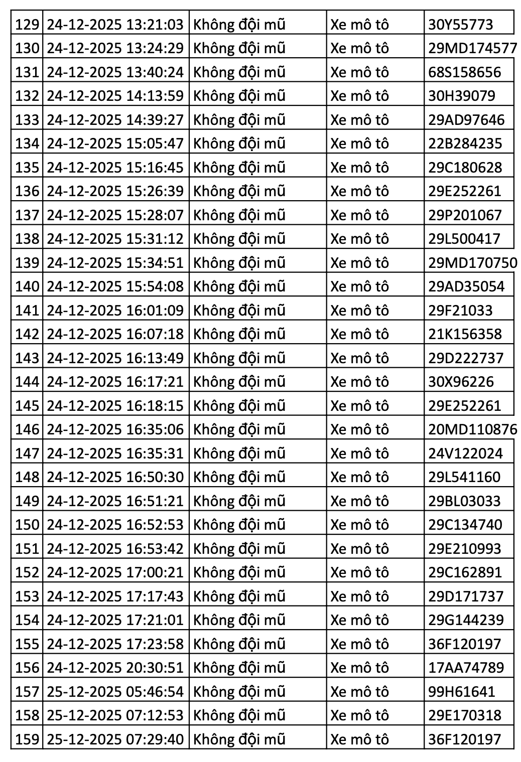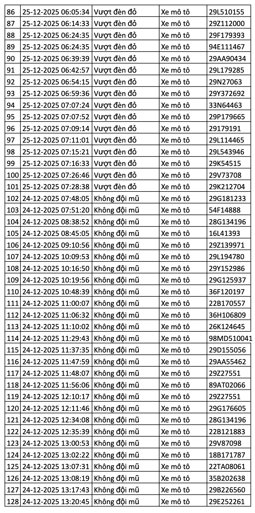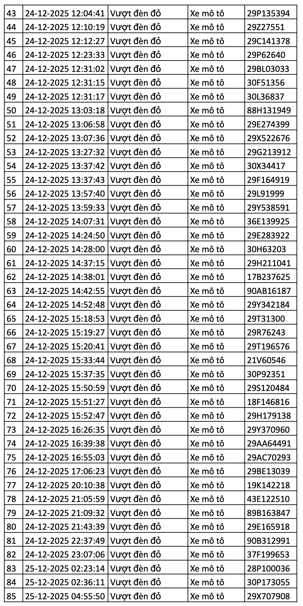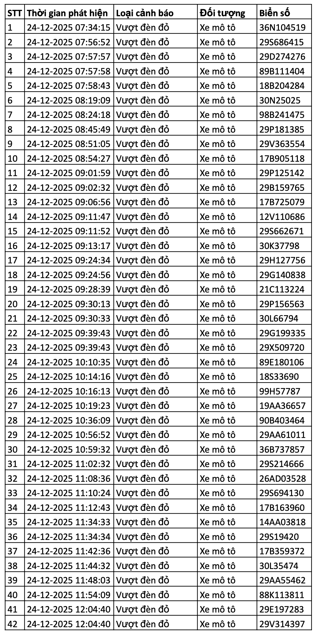 Danh sách các phương tiện giao thông được camera AI phát hiện vi phạm giao thông tại nội đô Hà Nội và cao tốc Nội Bài - Lào Cai 12h ngày 24/12 - đến 12h ngày 25/12/2025.