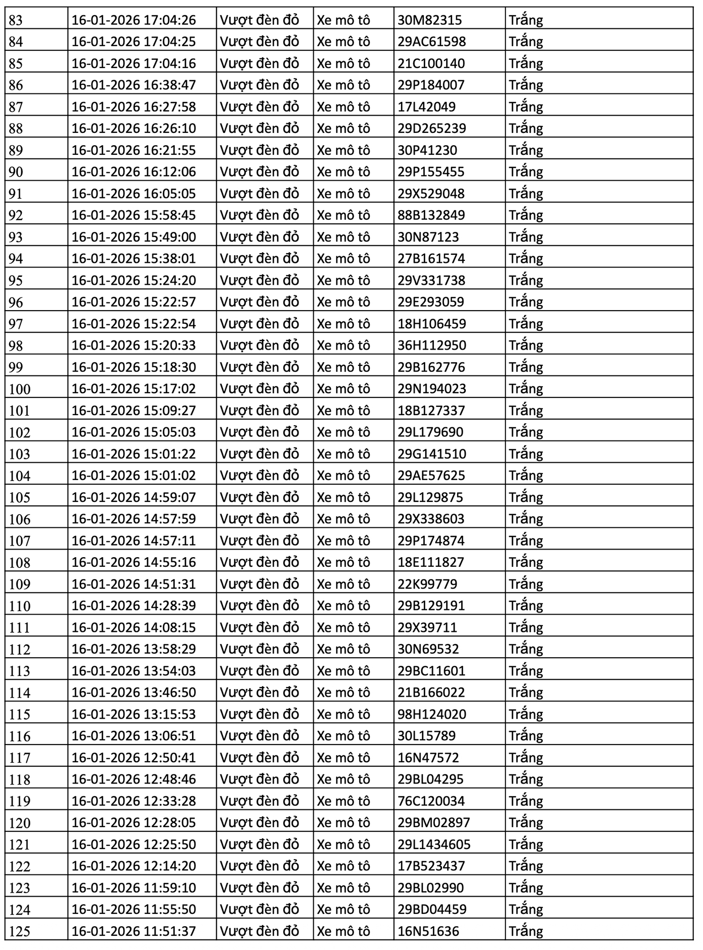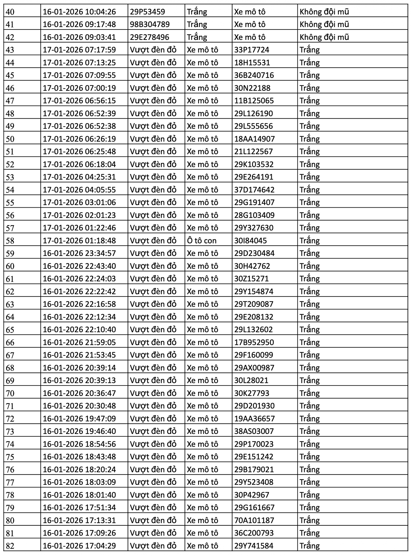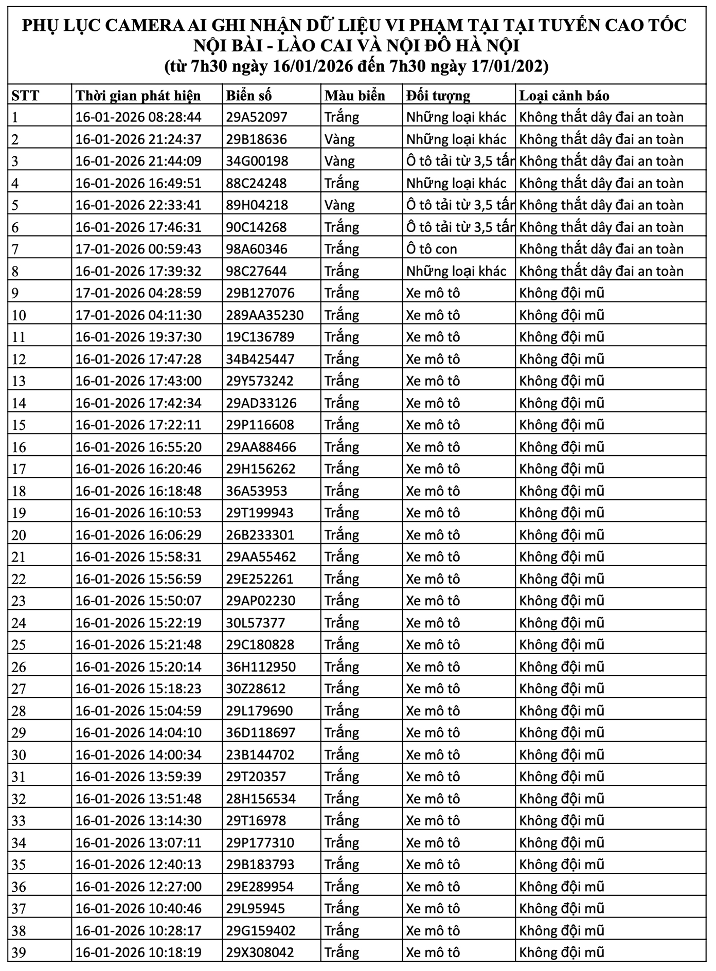 Trong danh sách này, các lỗi được hệ thống camera AI ghi nhận bao gồm: