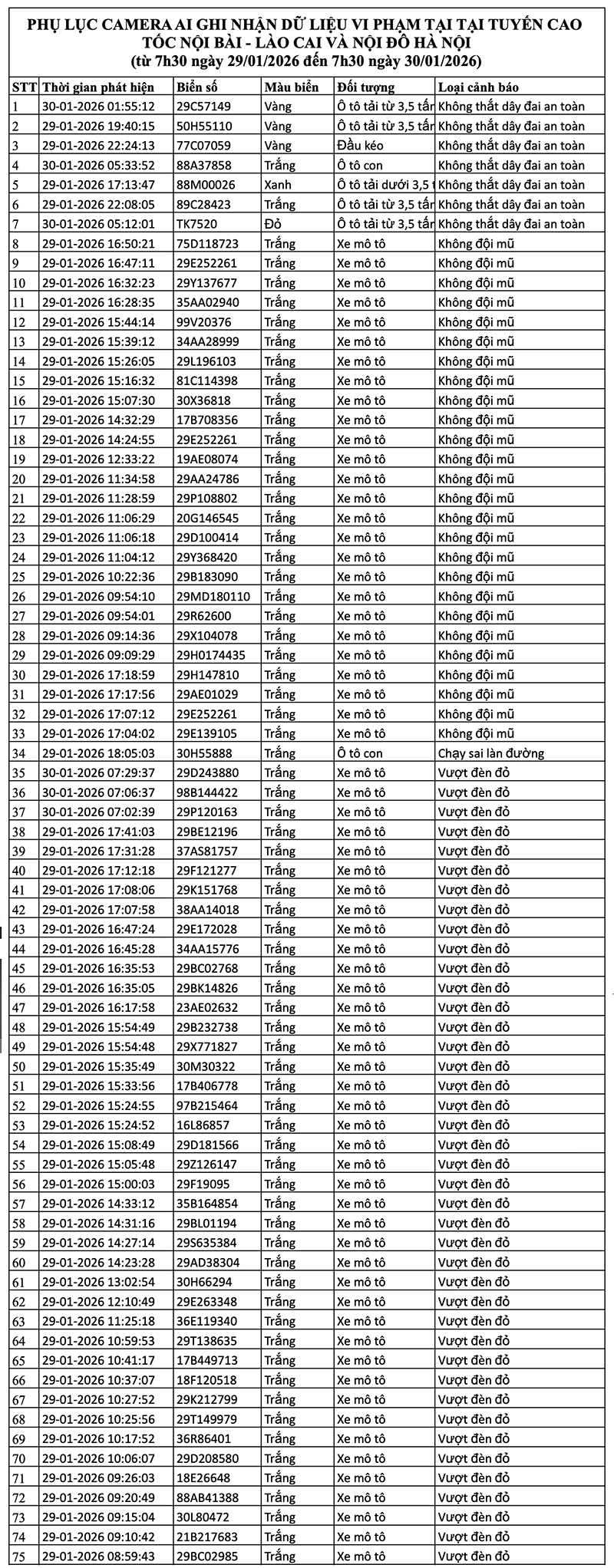 Danh sách các phương tiện giao thông được camera AI phát hiện vi phạm giao thông tại nội đô Hà Nội và cao tốc Nội Bài - Lào Cai 12h00 ngày 29/1/2026 - đến 12h00 ngày 20/1/2026.