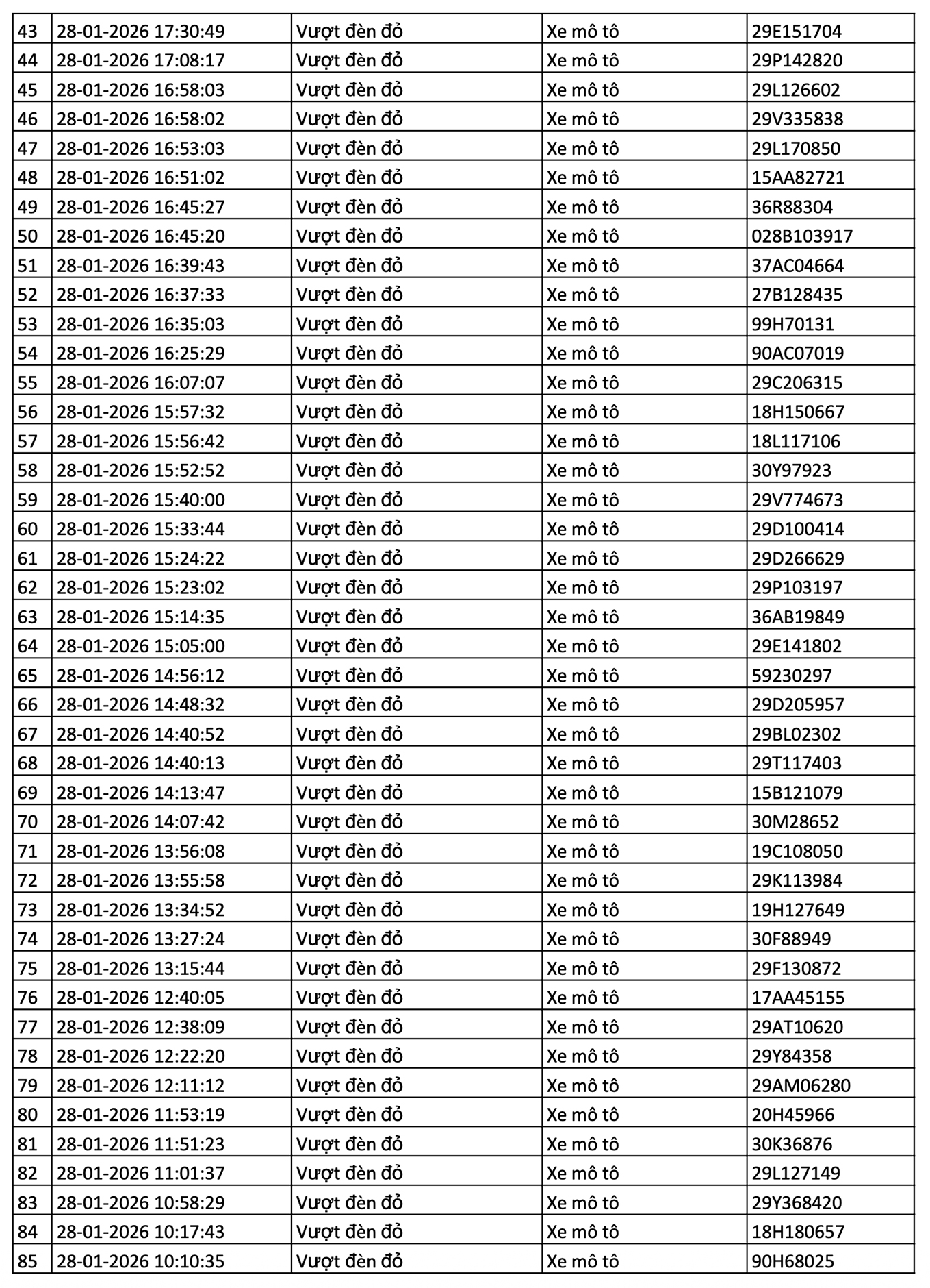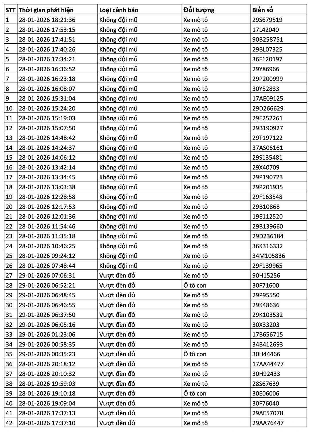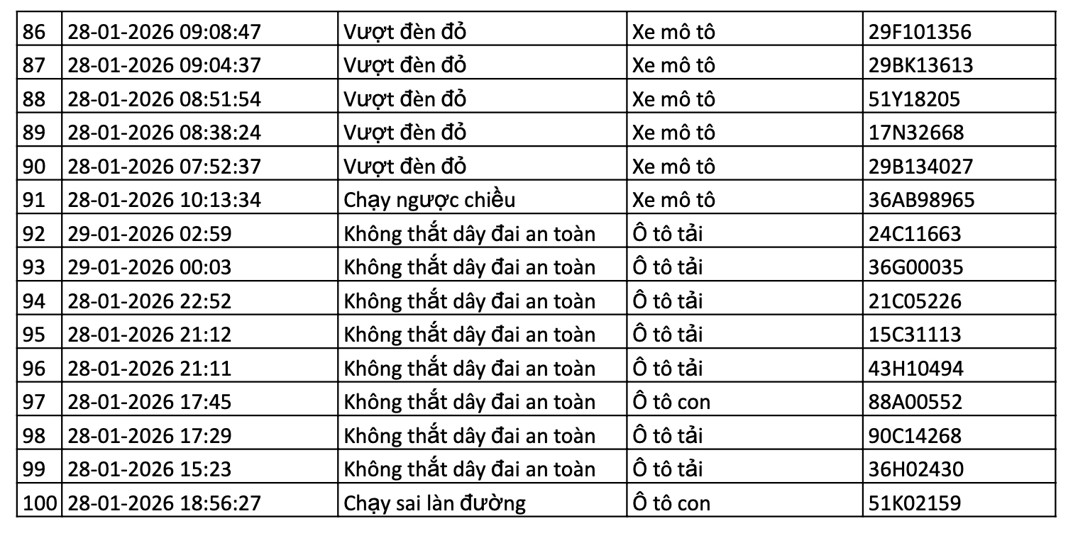 Danh sách các phương tiện giao thông được camera AI phát hiện vi phạm giao thông tại nội đô Hà Nội và cao tốc Nội Bài - Lào Cai 12h00 ngày 28/1/2026 - đến 12h00 ngày 29/1/2026.