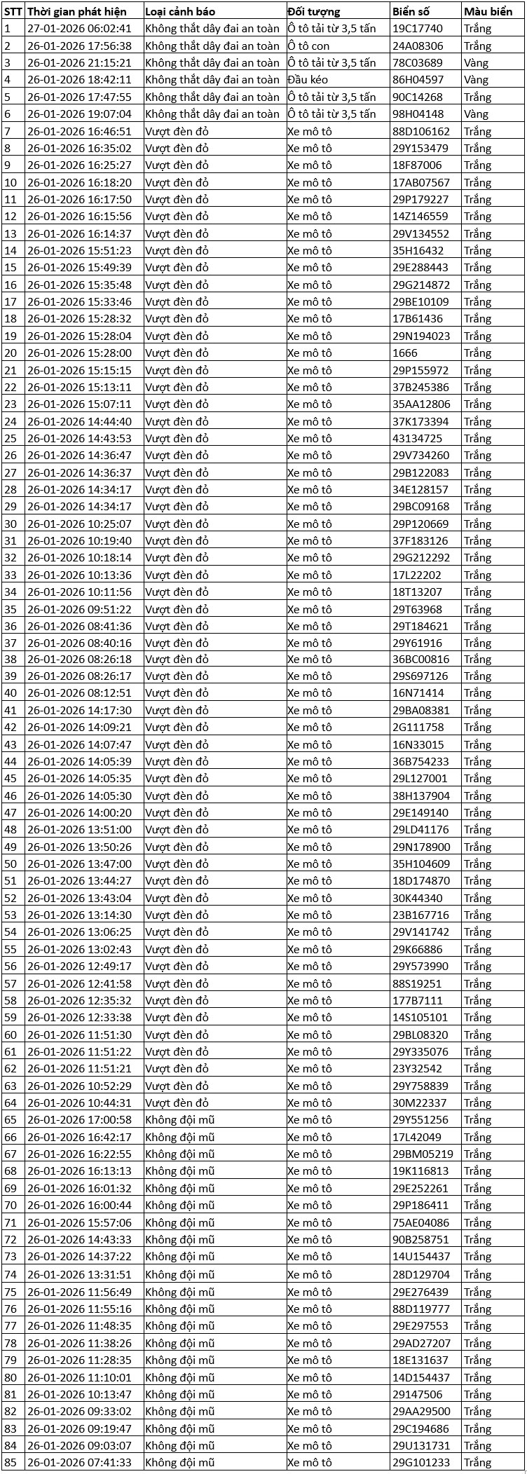 Danh sách các phương tiện giao thông được camera AI phát hiện vi phạm giao thông tại nội đô Hà Nội và cao tốc Nội Bài - Lào Cai 12h00 ngày 26/1/2026 - đến 12h00 ngày 27/1/2026.