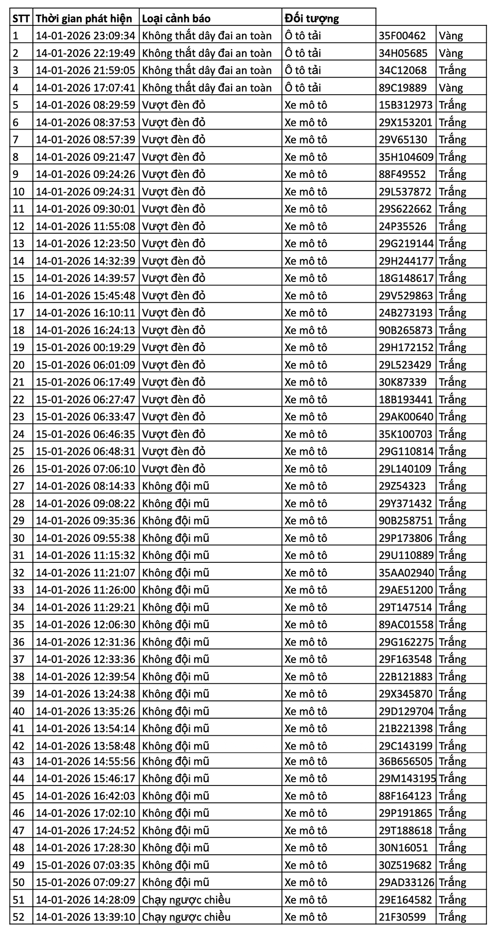 Trong danh sách này, các lỗi được hệ thống camera AI ghi nhận bao gồm: