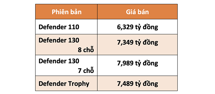 Giá bán các mẫu Defender 2026 tại Việt Nam.