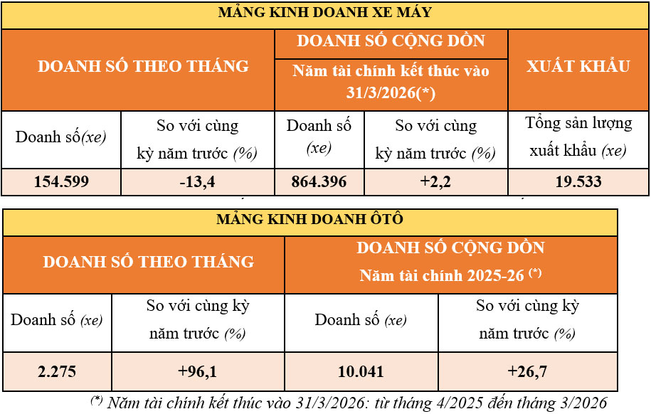 Trong 5 tháng vừa qua của năm tài chính 2025 - 2026, mảng kinh doanh ô tô đã mang đến cho Honda Việt Nam tổng cộng doanh số 10.041 chiếc, tăng trưởng 26,7% so với cùng kỳ năm tài chính trước đó.
