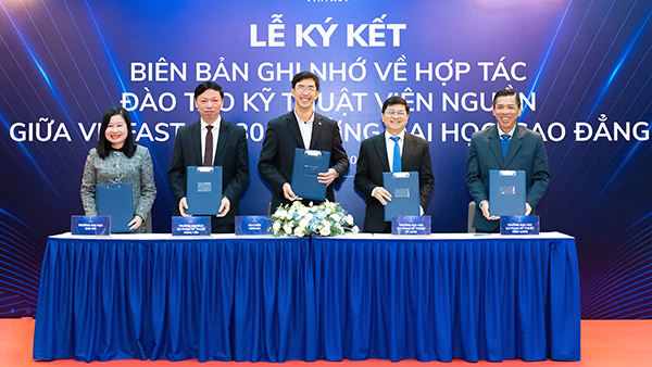 VinFast và 30 trường Đại học, Cao đẳng chuyên ngành kỹ thuật trên cả nước đã ký kết thỏa thuận hợp tác nhằm chuẩn hóa chương trình, giáo trình, tài liệu, học liệu, hướng tới mục tiêu phát triển nguồn nhân lực chất lượng cao, đáp ứng nhu cầu thực tiễn trong lĩnh vực sản xuất và sửa chữa ô tô điện.