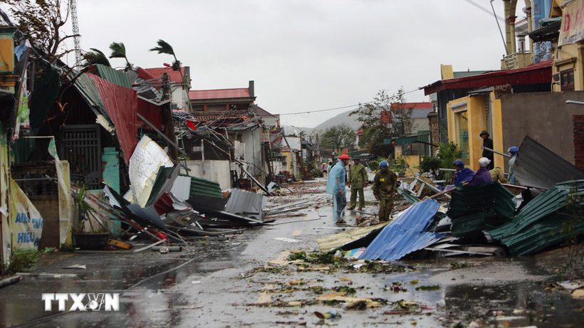 Nhà cửa của người dân tại xã Hoằng Giang (Thanh Hóa) bị gió bão đánh sập và tốc mái ngổn ngang. (Ảnh: Việt Hoàng/TTXVN)
