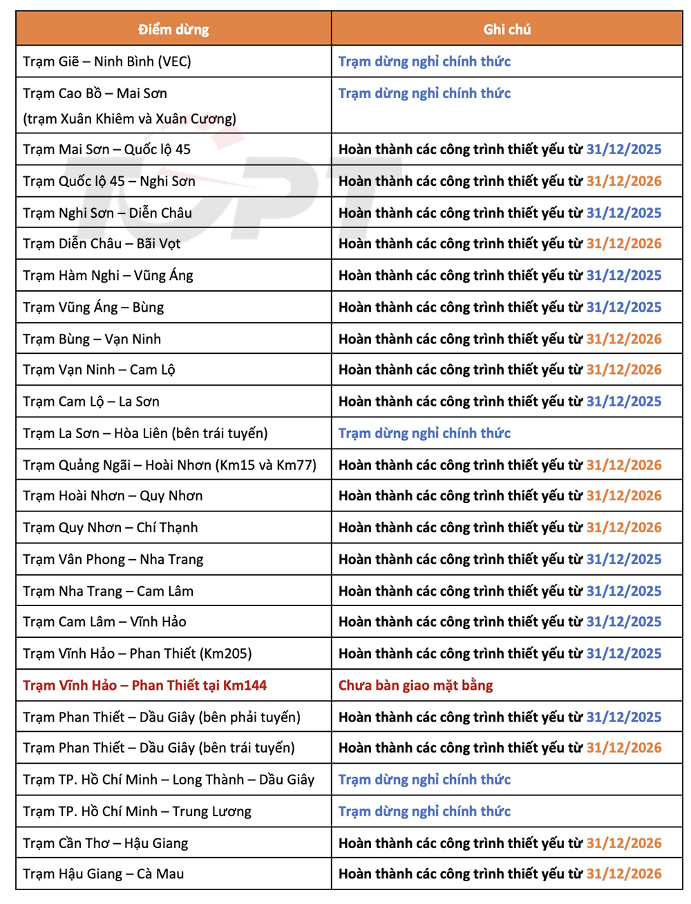 Danh sách các trạm dừng nghỉ mà người dân có thể sử dụng (và sử dụng tạm) trong dịp tết Nguyên đán 2026: