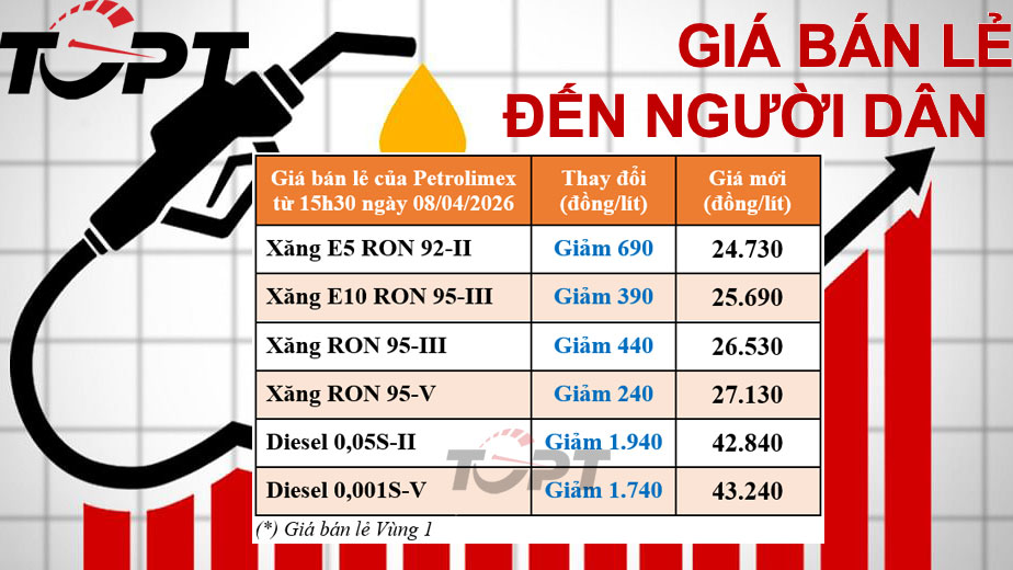Vào 15h30 ngày 8/4, Bộ Công Thương đã công bố đợt điều chỉnh giá bán dành cho các loại xăng dầu theo đúng quy định, giá cơ sở của các mặt hàng hiện như sau: Xăng RON 95-III không cao hơn 26.536 đồng/lít (giảm 440 đồng/lít); xăng E5 RON 92-II không cao hơn 24.737 đồng/lít (giảm 691 đồng/lít); dầu diesel 0,05S không cao hơn 42.841 đồng/lít (giảm 1.947 đồng/lít) và dầu mazut không cao hơn 24.271 đồng/kg (giảm 322 đồng/kg).